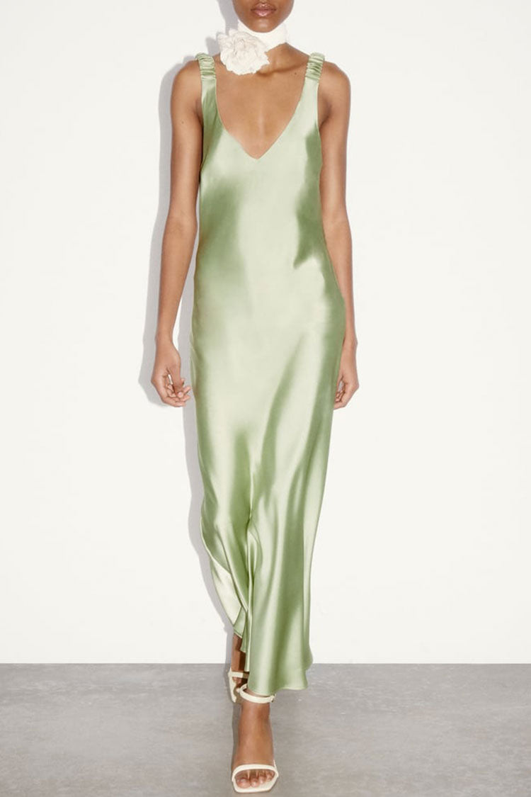 Welcome to our exquisite silky satin dresses collection. where glamour meets comfort in the form of this satin maxi dress. This soft sleeveless maxi dress in our boutique is a true representation of opulence and elegance. designed for women. Featuring alluring V-shaped cuts at front and back. elasticated suspender straps with ruched detailing. a fluid effect tank silhouette with a flared. long dress cut. this breezy summer sun dress drapes over your body effortlessly. enhancing your curves and accentuating your figure that is perfect for any occasion. Whether you are attending a wedding. prom. or any other formal event. this glamorous party outfit is sure to make you stand out in a crowd.