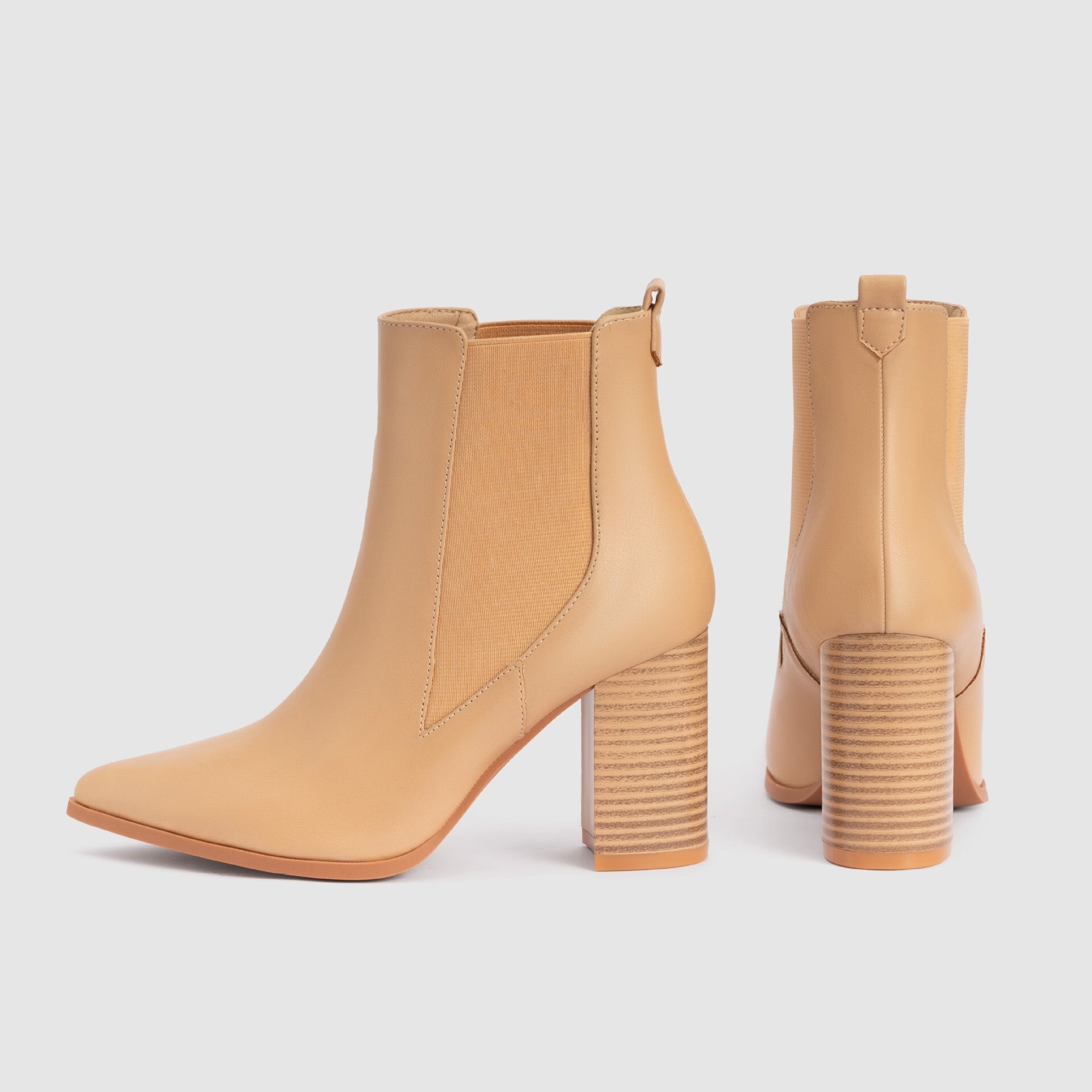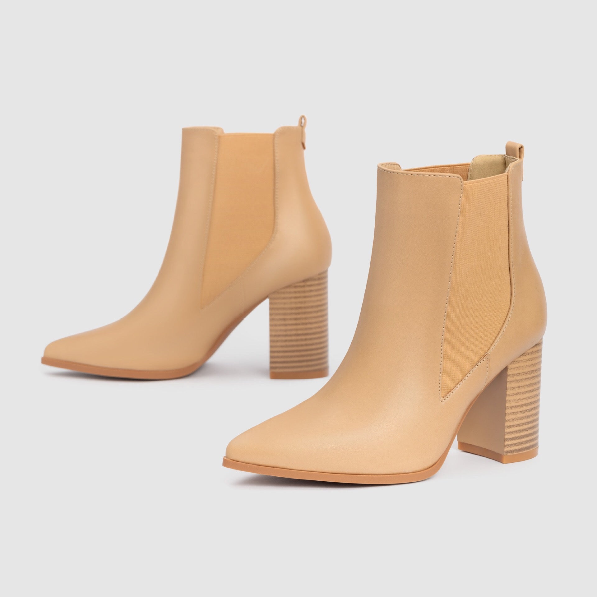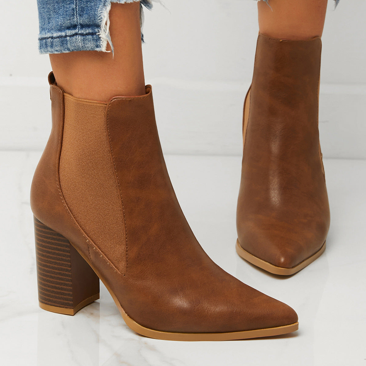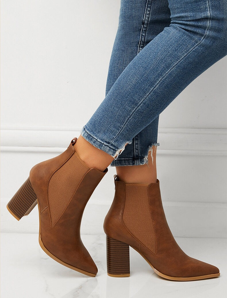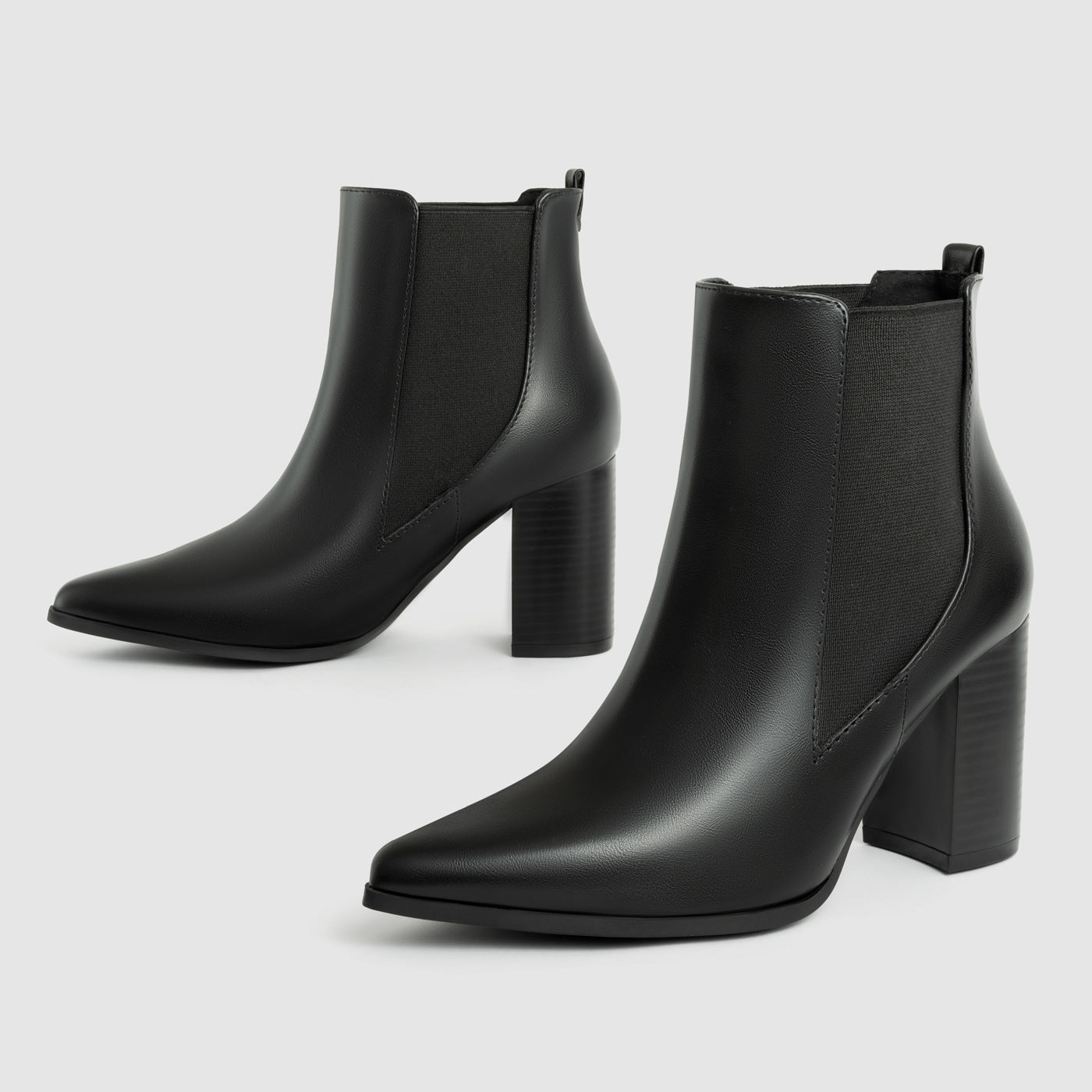Keep it simple and always chic.These basic black booties feature a pointed toe. a chunk heel. and elastic gore for easy slip-on wear with visual appeal! Boots are made of a faux leather material.