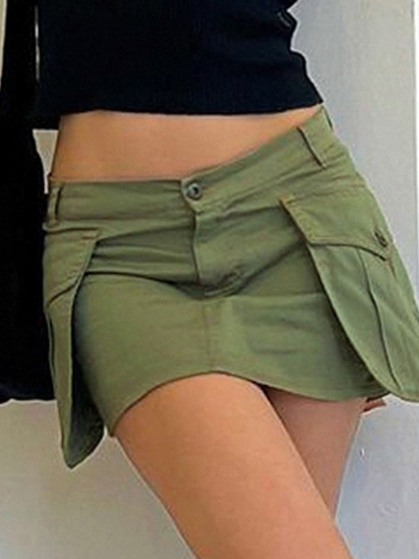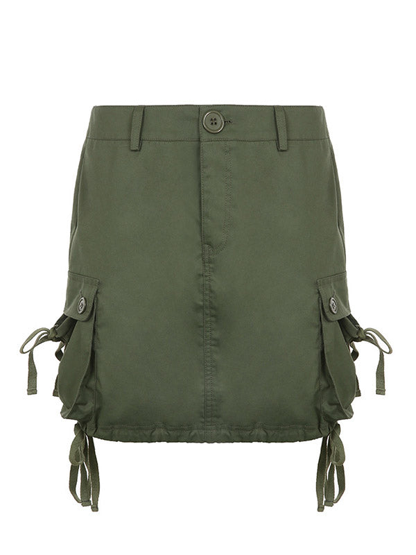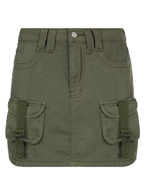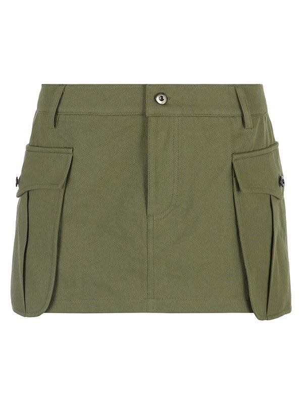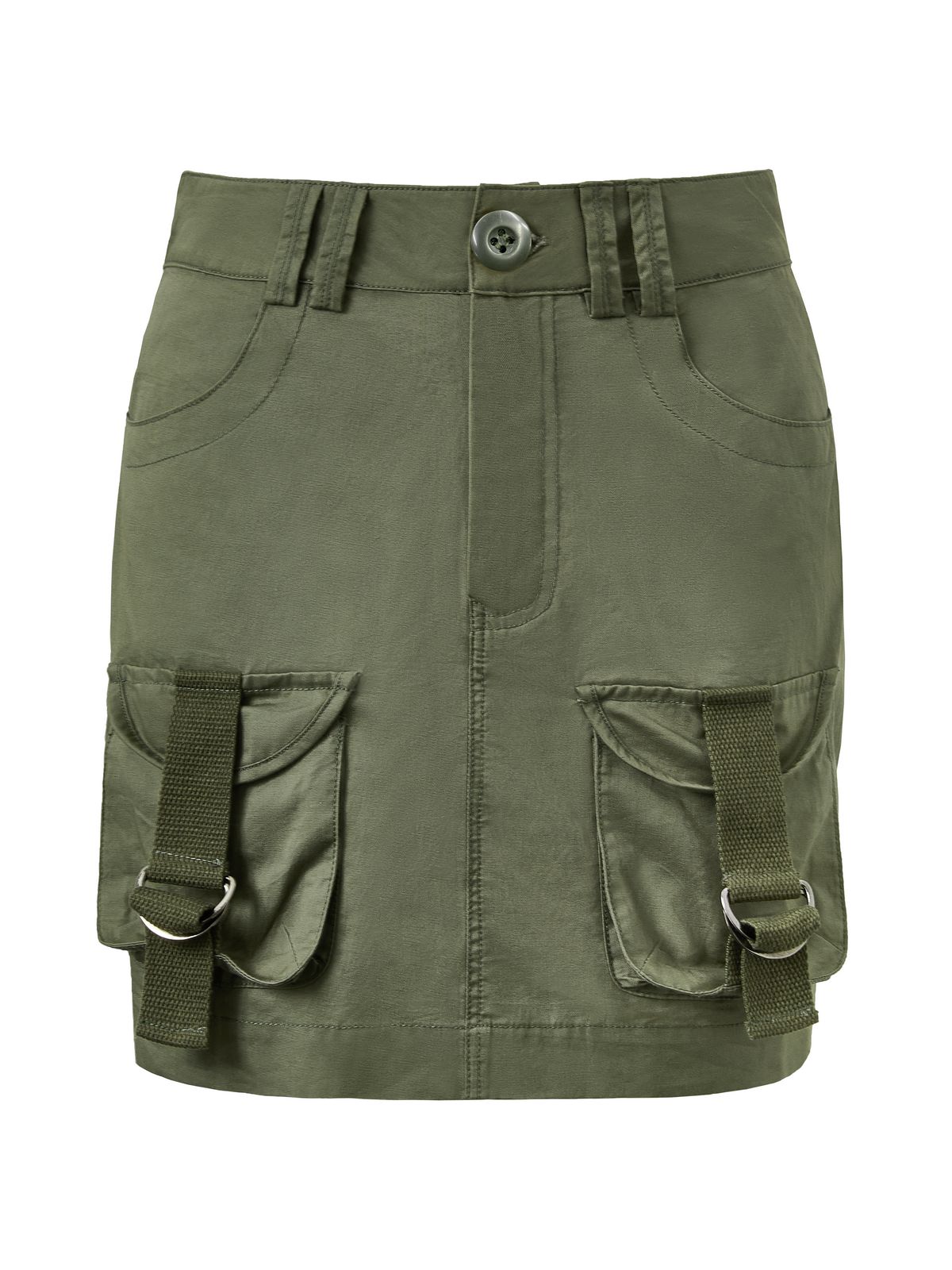 Design: This parachute cargo skirt shaped to a-line silhouette. features cargo pockets patched with strap detailing. with multi belt loops and a zip button fastening design.