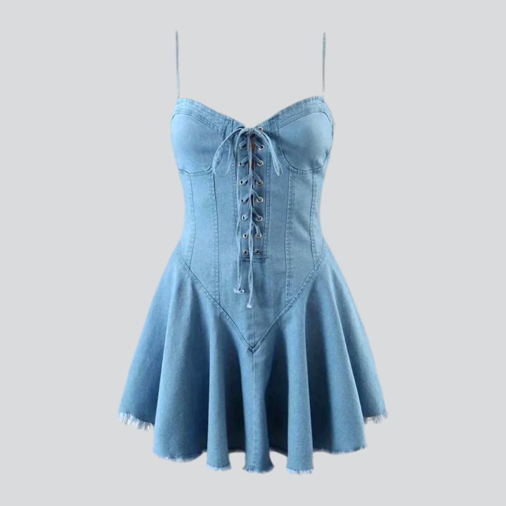 Experience the perfect balance of vintage charm and fashion vibrancy with this iconic denim dress. Its enduring spaghetti-straps are perfect for summer's warm embrace. while the audacious unrefined hem is a statement of couture-forward audacity. This dress is a work of art that puts you in the spotlight.