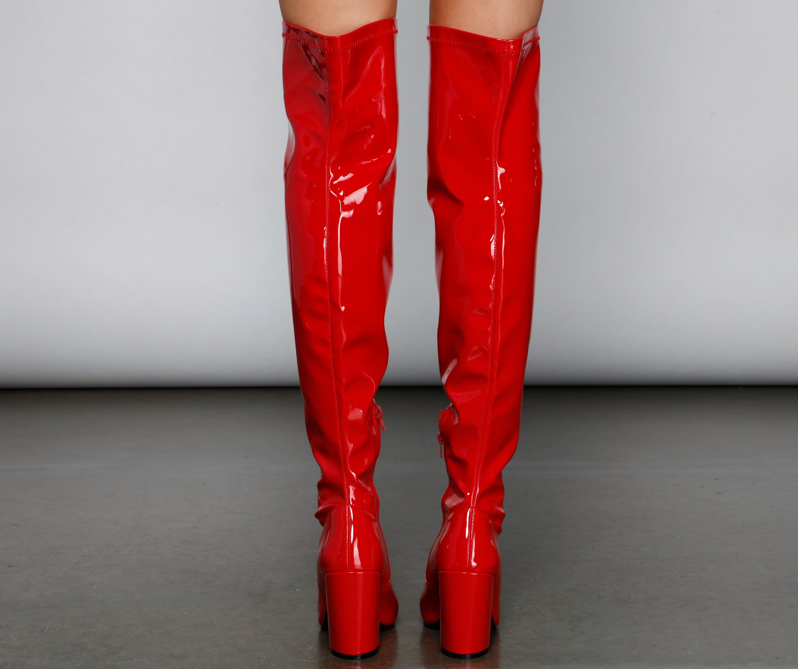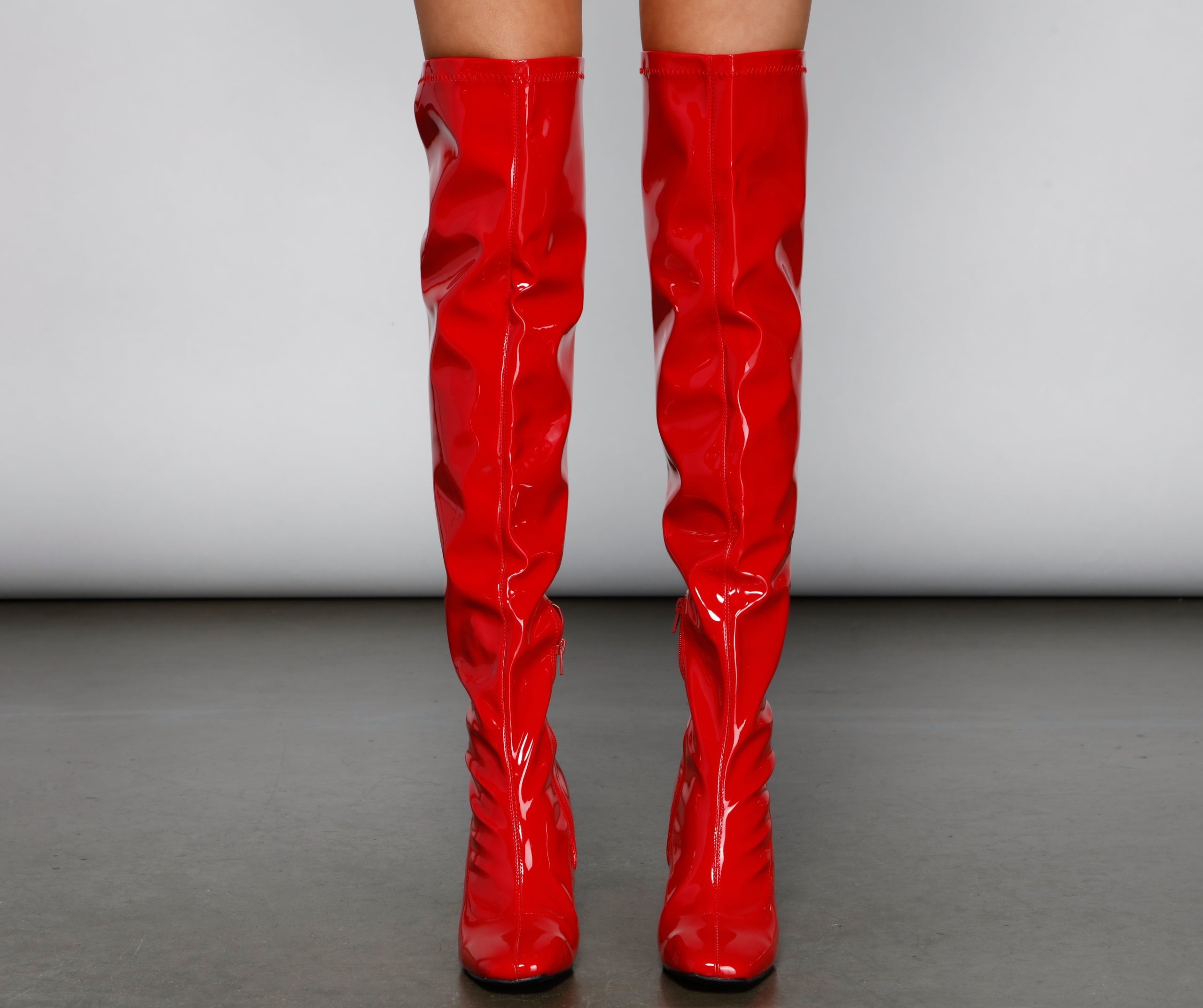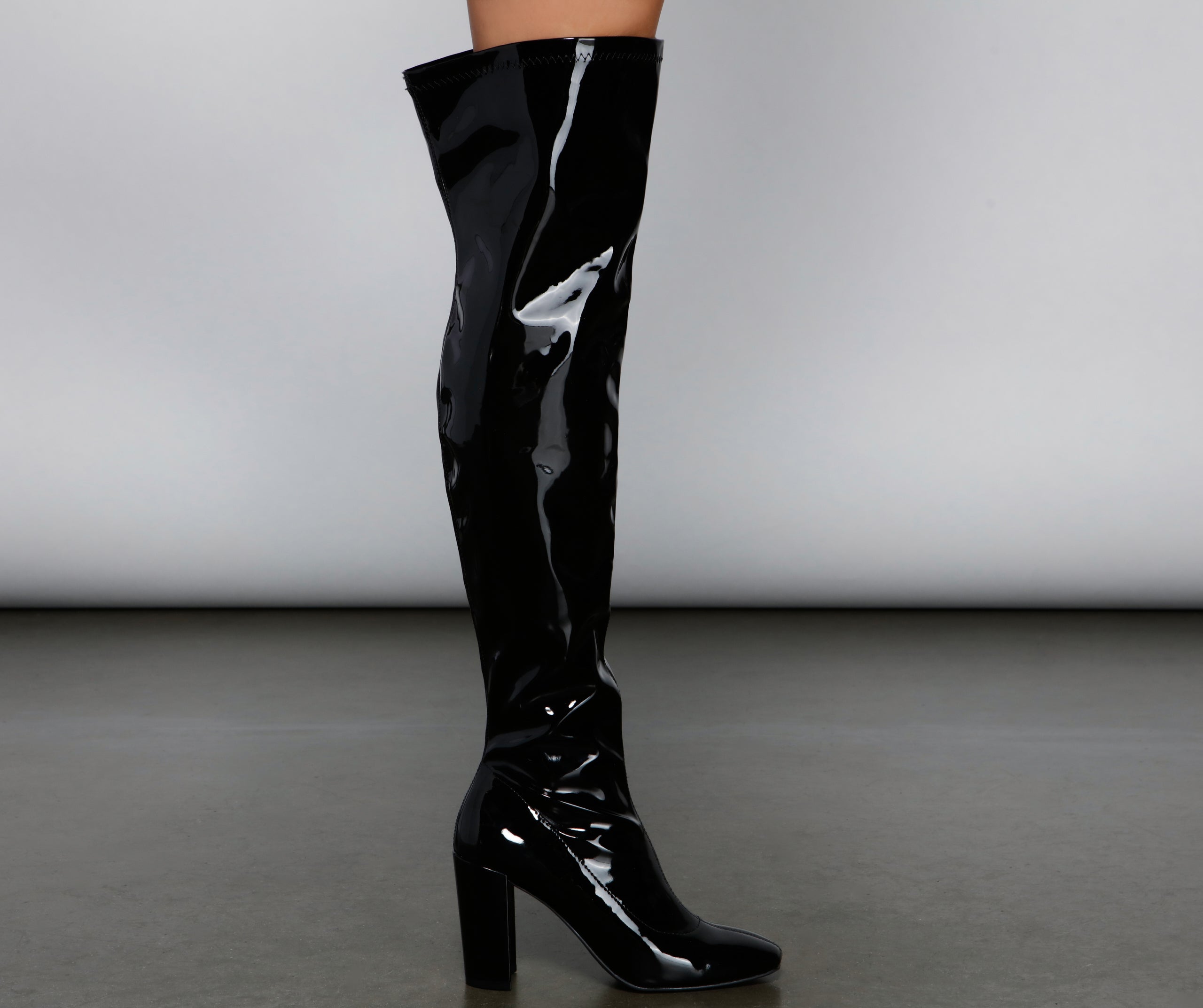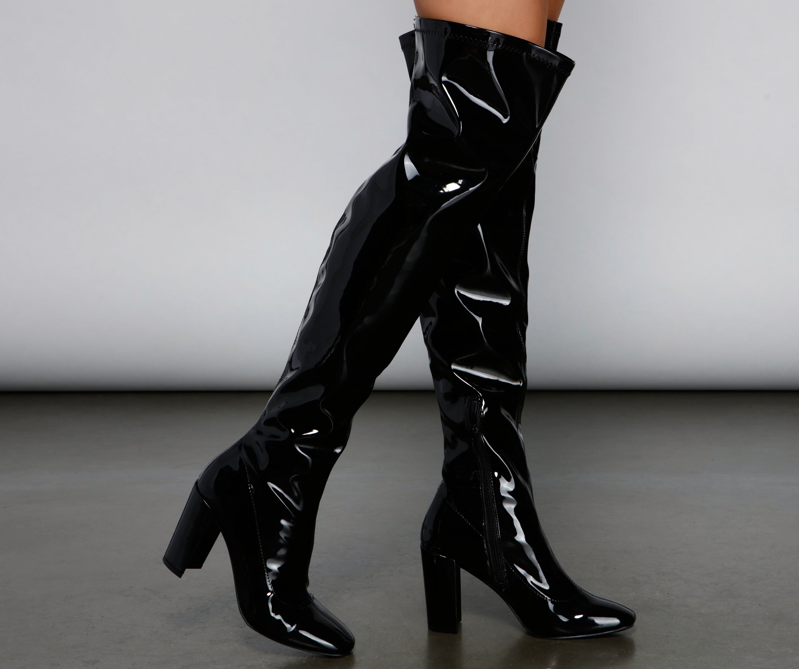 You'll be so seductive in this pair of thigh-high boots! They're made of faux patent leather with an almond toe. block heel. and a side zipper closure. Wear them with a bustier and mini skirt for your next night out.
