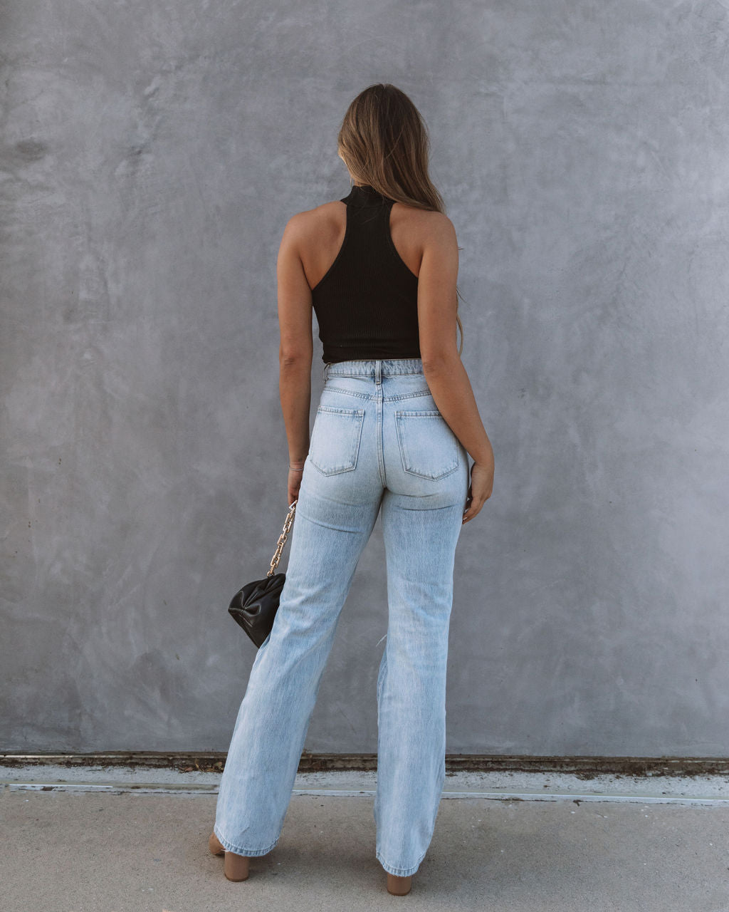 Choker tops are totally back! Our Starla Knit Choker Top comes in black with a strapless front neckline. Detailed with a back racerback and front choker. Designed in a comfy. ribbed fabrication. Styled with the Perfect Hoop Earrings. Chic Crossbody Chain Pouch Bag. Leslie High Rise 90's Flare Denim. and Colby Faux Suede Heeled Bootie.