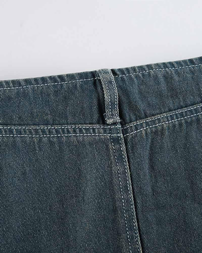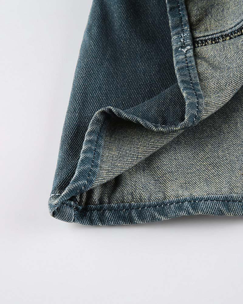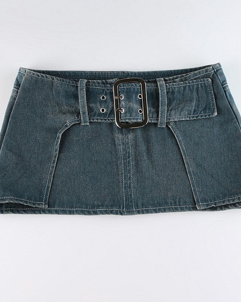 Details: Short denim skirt with front belt design