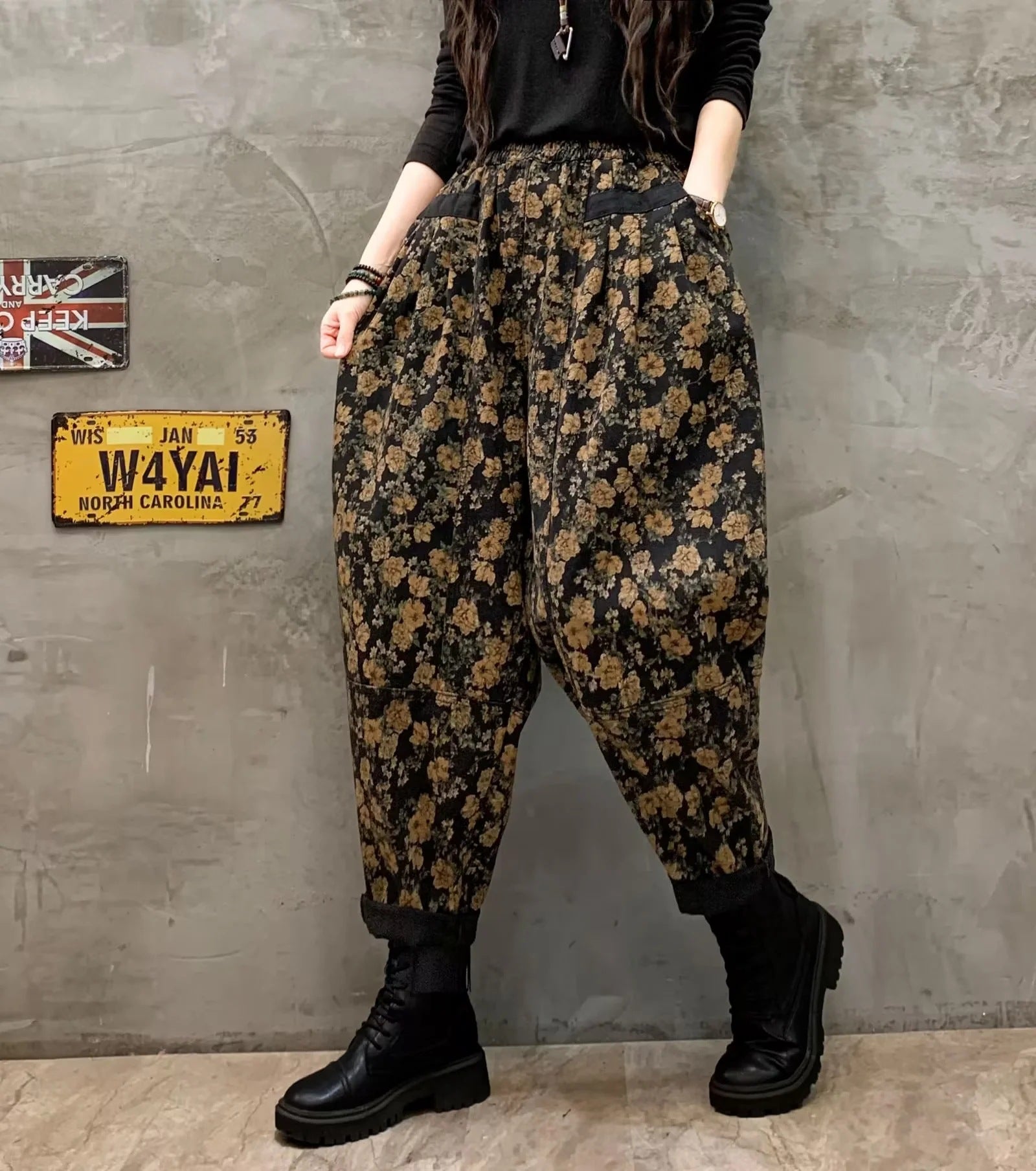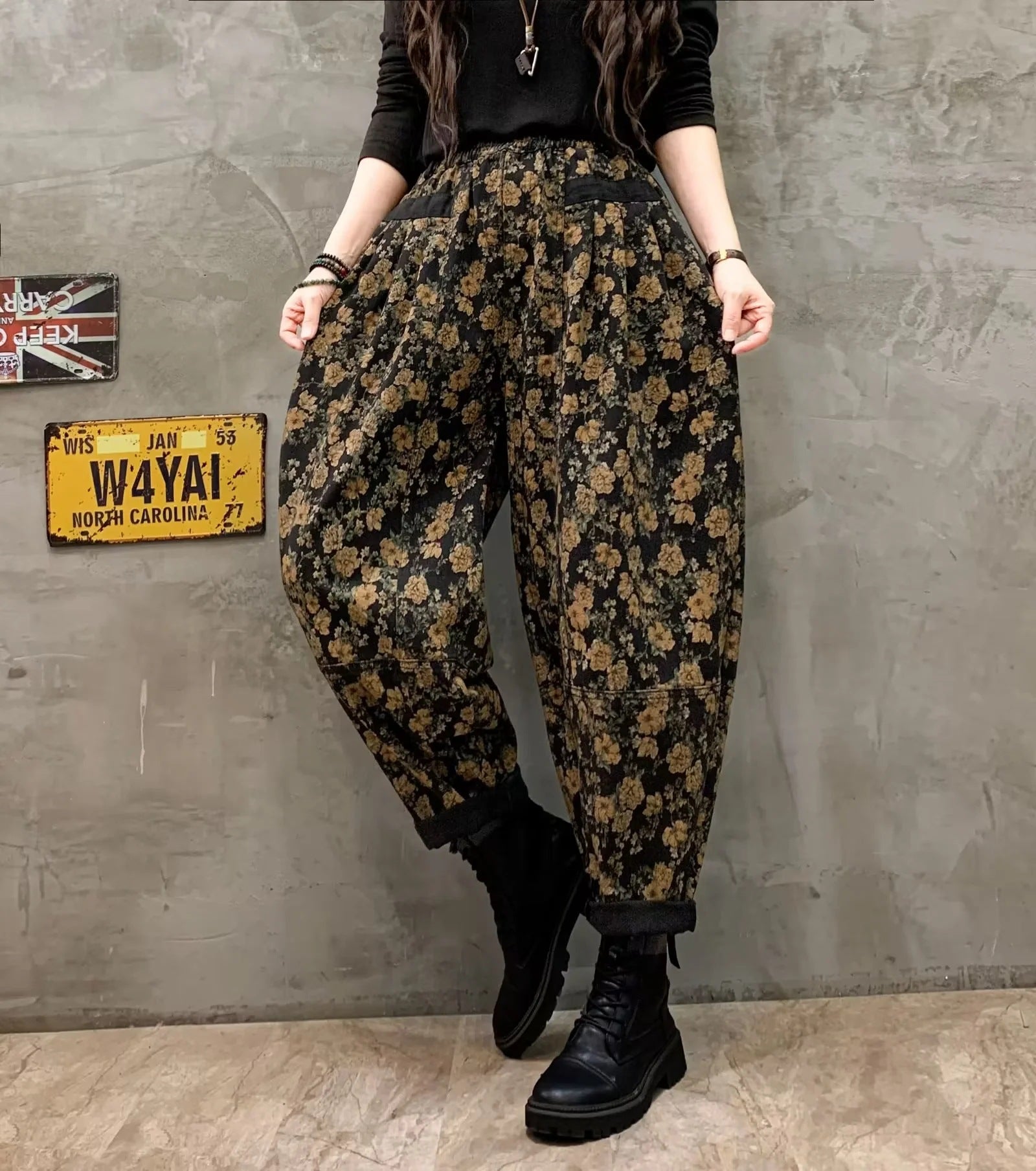 Stylish Black Cinched Print Loose denim Pants Trousers Winter