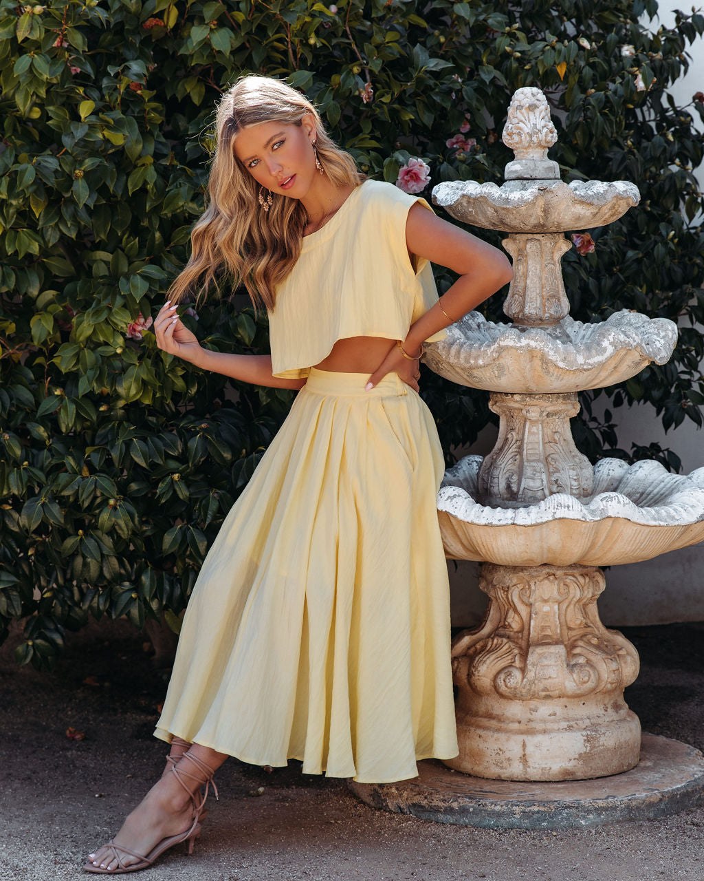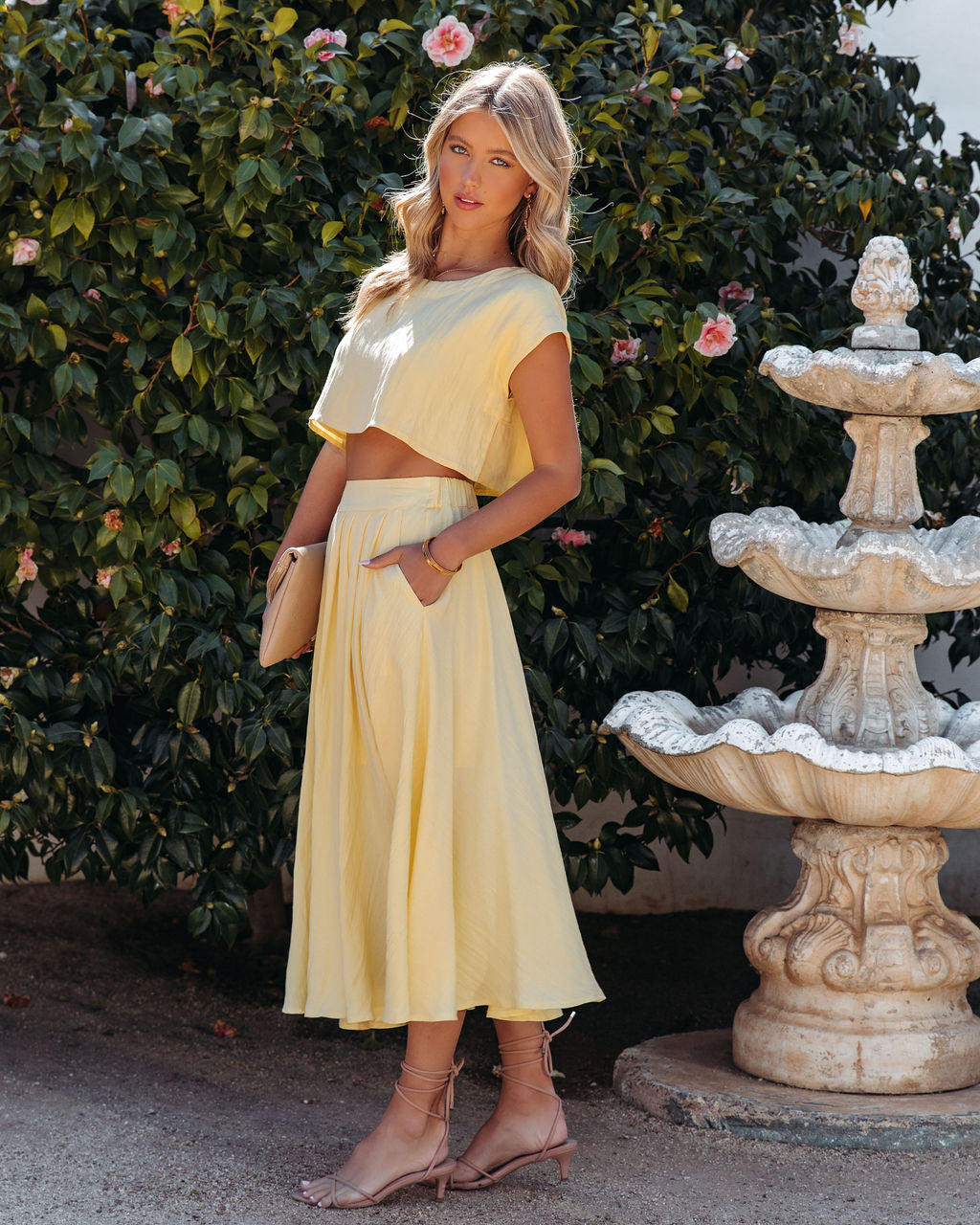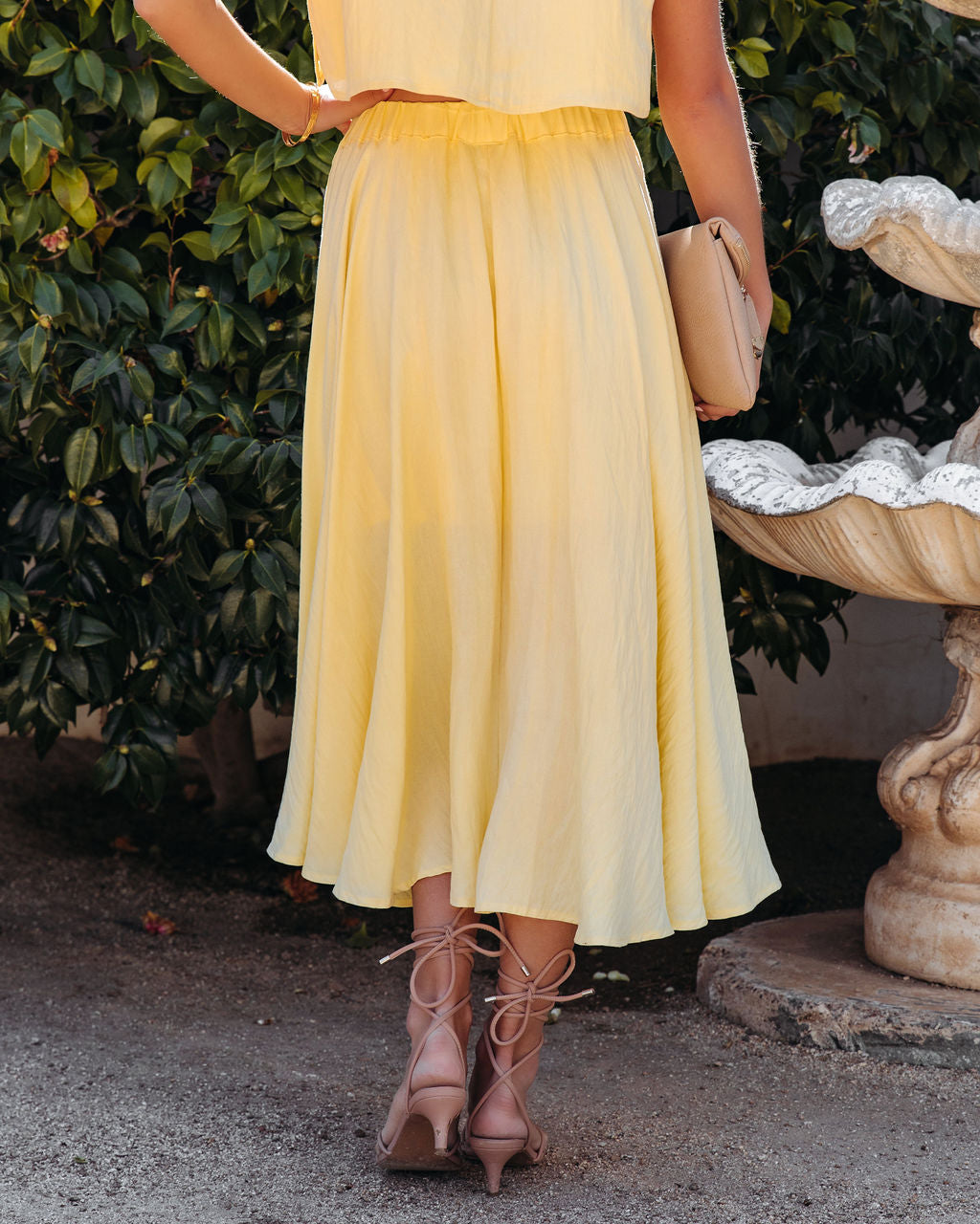 Charming for spring. the Veronica Pocketed Woven Midi Skirt in yellow features side pockets and a flowy skirt.
