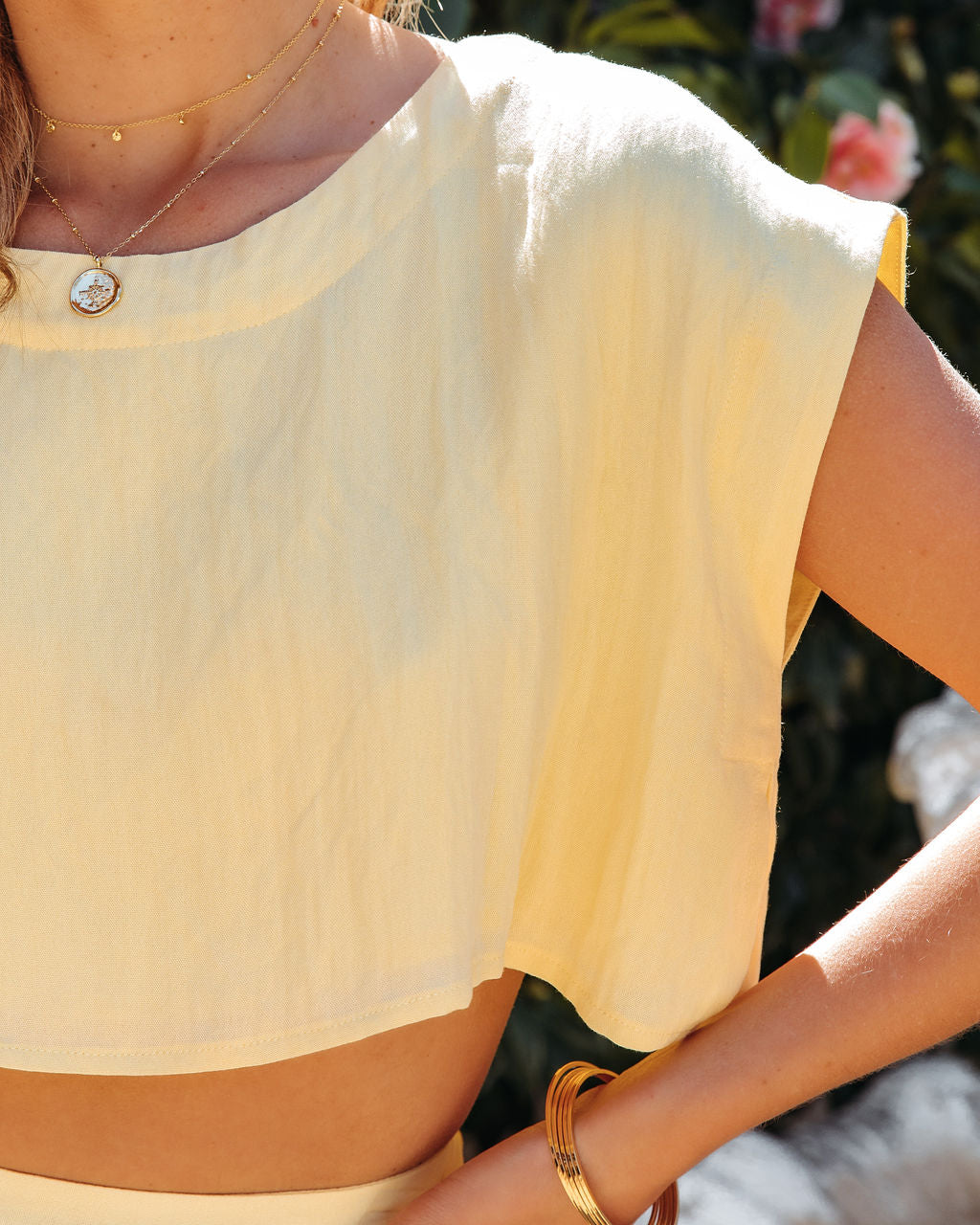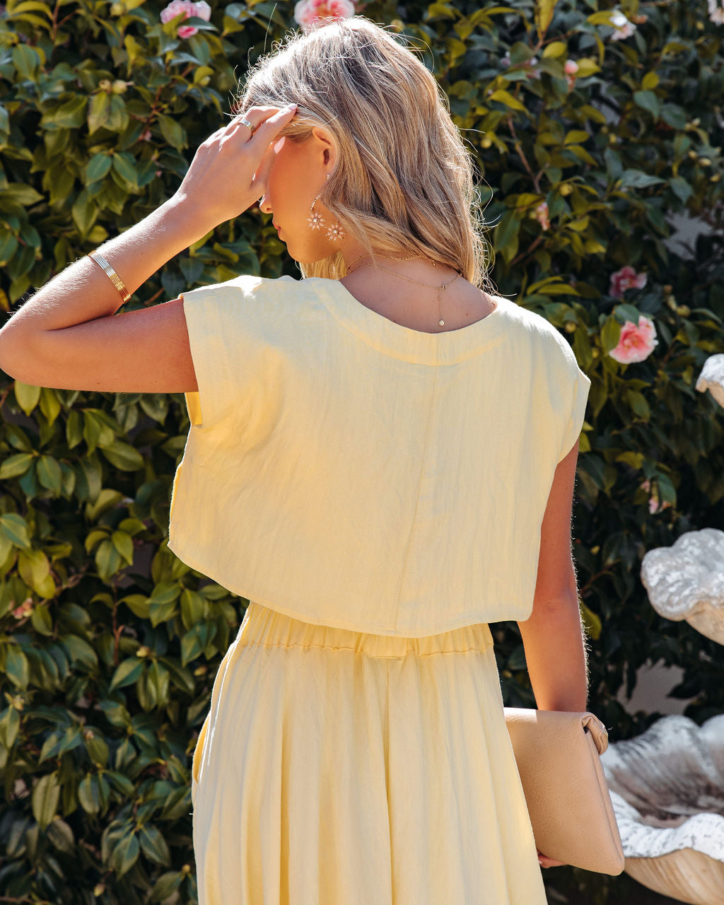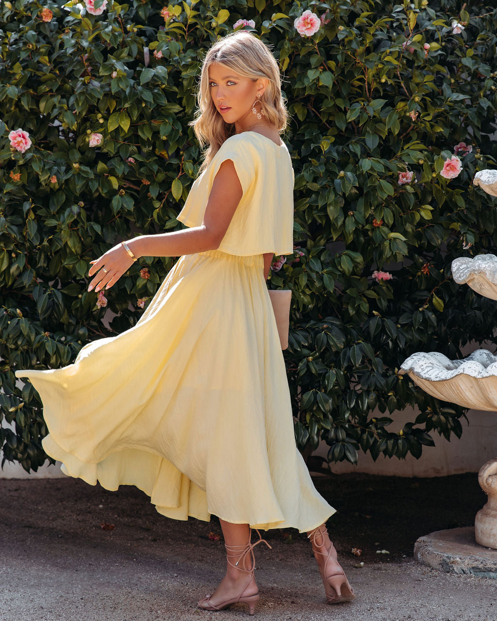 Charming for spring. the Veronica Pocketed Woven Midi Skirt in yellow features side pockets and a flowy skirt.