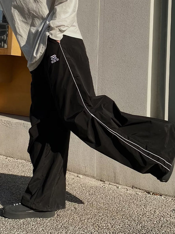 Description: These girls parachute style pants are retro and sporty. Cuts to a super relaxed silhouette. they have a drawcord tie waist style. features contrast piping details along the side. with front side pockets. and has a logo detail on it.