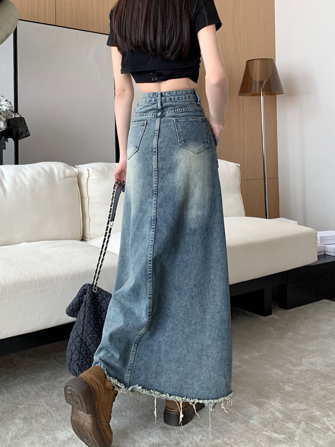 Introducing our vintage sanded long denim skirt from the 2023 Spring-Summer Collection âââ€?the perfect blend of urban trend and nostalgic charm!