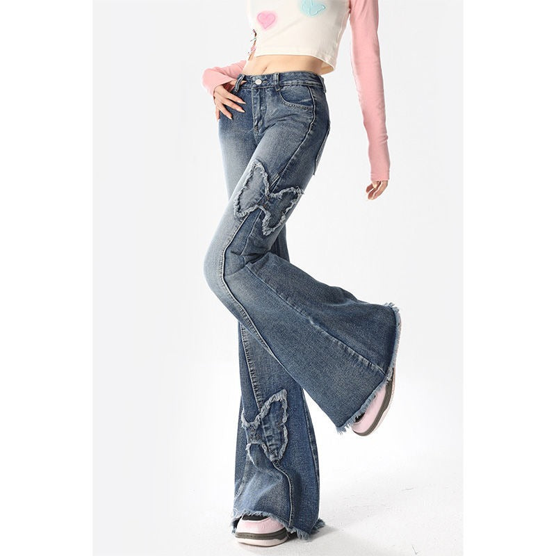 Description: Dive into retro vibes with our Vintage Butterfly Flare Jeans. These stylish jeans feature a flared leg design that adds a touch of drama to your outfit. Made with a comfortable blend of cotton and polyester. they are perfect for all-day wear. The low-rise waistline and functional pockets offer both style and functionality. Complete with a zip and button fastening. as well as multiple belt loops. these jeans are a must-have for any fashion-forward individual.