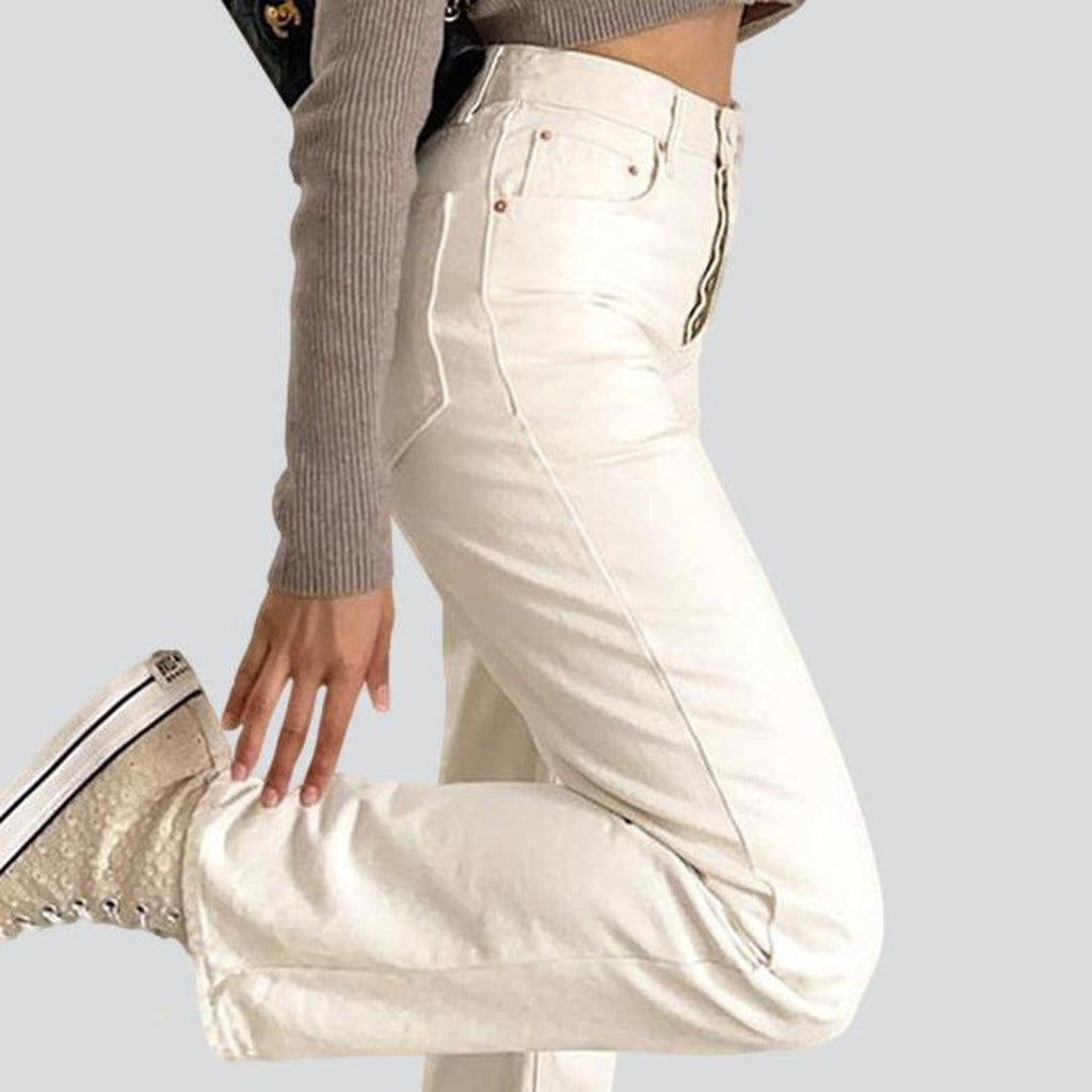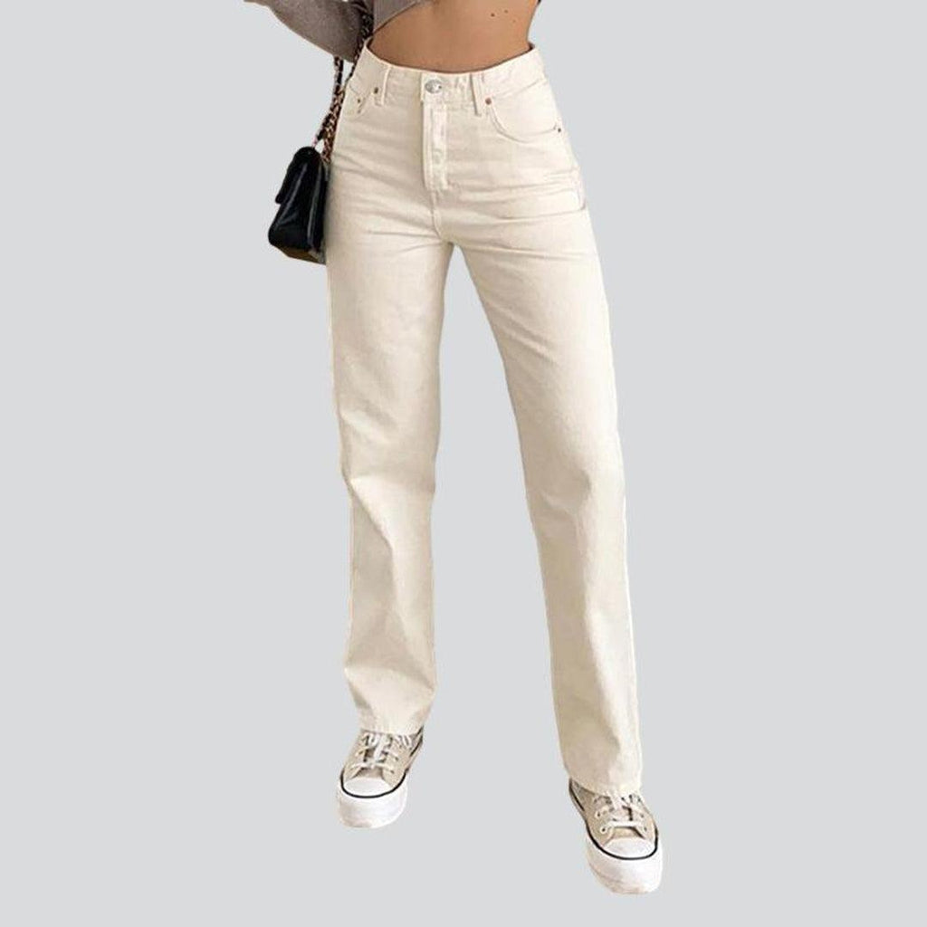 Introducing the latest addition to our 2023 Spring-Summer Collection: the perfect blend of 90s nostalgia and trendy fashion. our monochrome white straight women's jeans! Crafted from luxe denim with a high waist and zipper & button closure. this piece offers timeless sophistication and a bold statement.