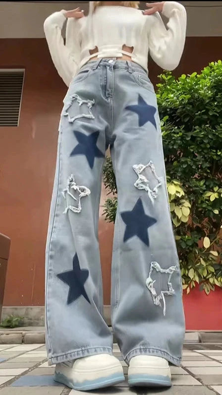Add a touch of retro flair to your wardrobe with the Y2K Baggy Blue Star Jeans. These trendy jeans feature a light blue wash adorned with bold. contrasting star patches in various shades of blue. The distressed star appliqués add a unique. handmade feel to the design. With their high-waisted. relaxed fit and wide legs. these jeans offer both comfort and style. perfect for a casual day out or a night on the town. Pair them with your favorite crop top or oversized sweater for a nostalgic yet modern look. Embrace the Y2K revival and stand out with these statement-making jeans.