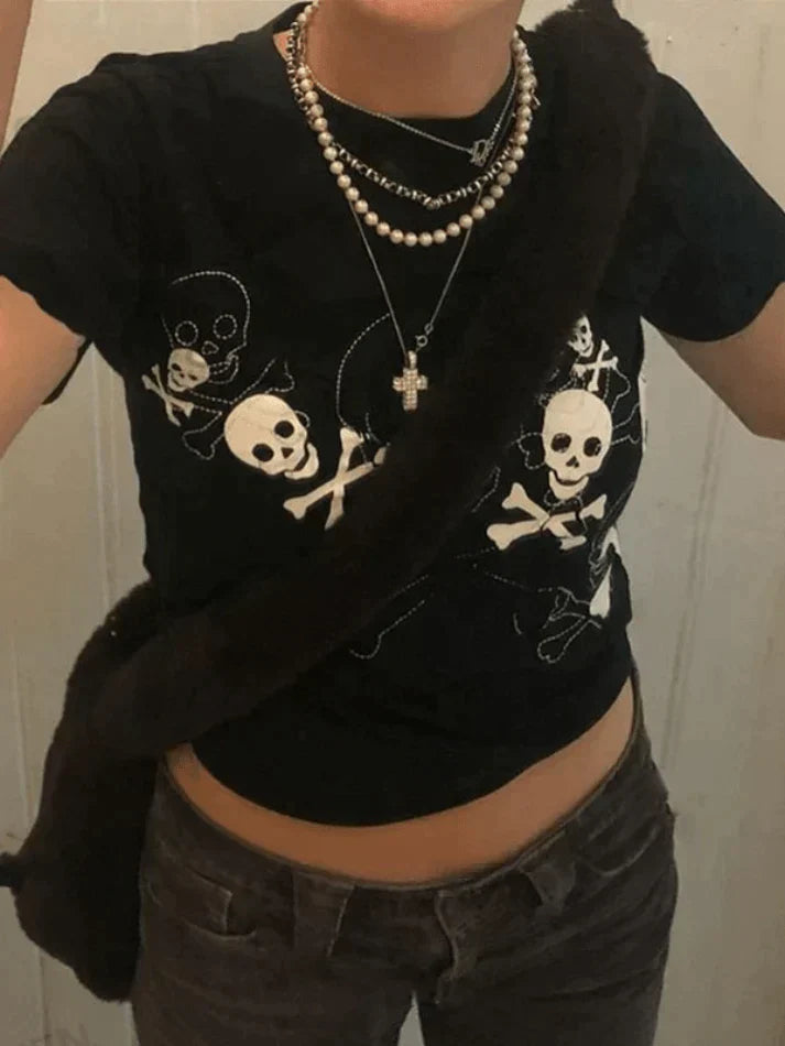 Beschreibung: Mit diesem bezaubernden Crop-Top bringst du deinen Y2K-Style auf ein neues Level. Es ist leicht verkürzt und hat einen charmanten Totenkopf-Print auf der Vorderseite. Die strukturierten Schultern verleihen deinem Outfit einen trendigen Touch. Hergestellt aus einer Polyester-Baumwoll-Mischung bietet es eine schmale Passform, die deine Figur betont. Mach dich bereit, deinen Y2K-Style mit diesem Must-have zu rocken.