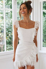Merkmale: Unser wunderschönes Kleid ist ein absolutes Muss. Es besteht aus strukturiertem, besticktem weißem Stoff. Es hat einen quadratischen Ausschnitt, wunderschöne Rüschenärmel, einen Wickelrock mit seitlichem Stoffband, bestickte Details am Saum und einen Rücken mit unsichtbarem Reißverschluss.