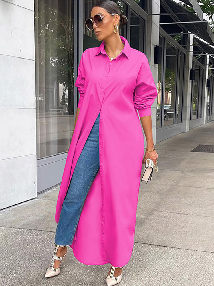 Merkmale: Zuknöpfen. Übergroßes, fließendes Maxihemd. Offene Vorderseite. Blusenhemd mit asymmetrischem Saum. Langes Strandkleid. Hoher, niedriger Saum. Geschlitzter Schnitt. Lockere Passform. Lange Ärmel. Umlegekragen.