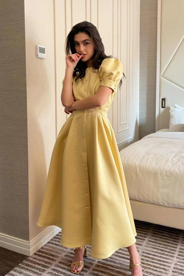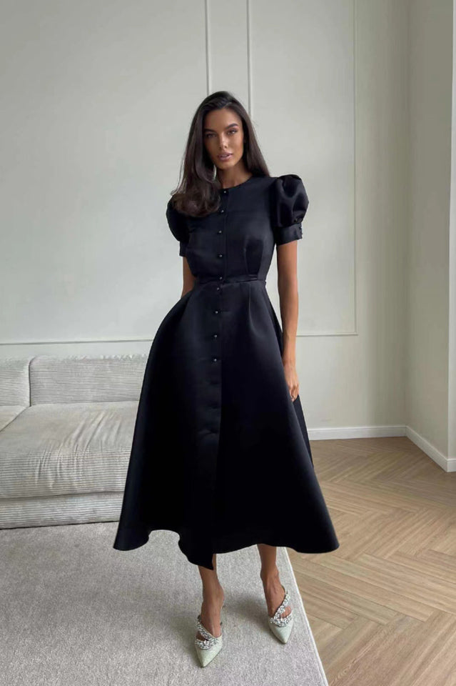 Prinzessin Charming betritt den Raum. Ein exquisites Minikleid mit flauschigem Rock. Der Satinstoff und die Laternenärmel verleihen diesem Kleid einen Hauch von Luxus. Die Taille betont die Silhouette, während der flauschige Rock Leichtigkeit verleiht. Mit Knöpfen zu schließen.