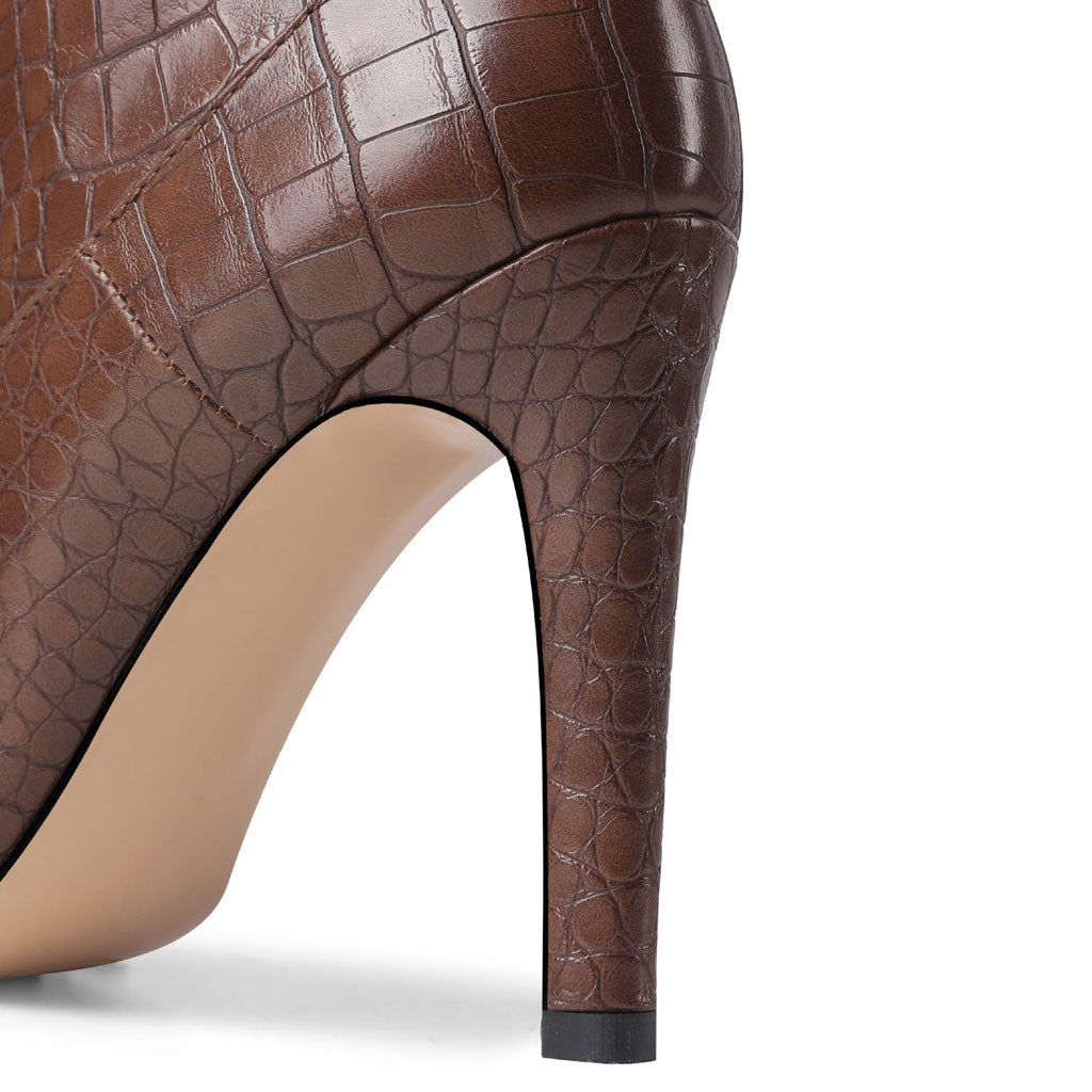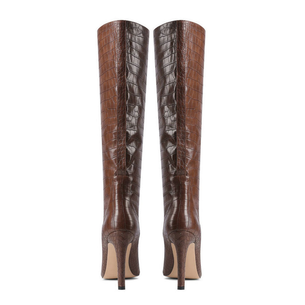 Sie versprechen einen bleibenden Eindruck. Diese eleganten Stiefel sind das ultimative Hingucker-Design und ein Must-have für die kommende Saison. Dieses Paar aus hochwertigem Kunstleder mit Krokodileffekt wirkt edel. Die farblich abgestimmten Nähte am Knöchel sorgen für eine fest sitzende Silhouette, während der weite Schaft Ihr Bein unterhalb des Knies gut umschließt. Dieses Statement-Paar mit dünnem Stilettoabsatz wird durch eine verlängerte spitze Zehenpartie vorne aufgewertet, die explizite Sinnlichkeit und weiblich inspirierte Ästhetik widerspiegelt. Dieser Stil passt gut zu hautengen Jeans und Minikleidern oder -röcken und ist das perfekte Outfit für den lässigen Alltag. Denken Sie daran: Dinge kommen und gehen, aber diese Stiefel bleiben.