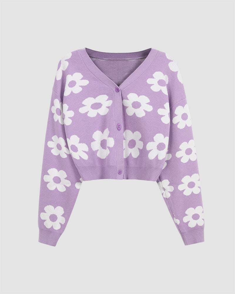 Details : Kurze Strickjacke mit wiederholtem Gänseblümchen-Print
