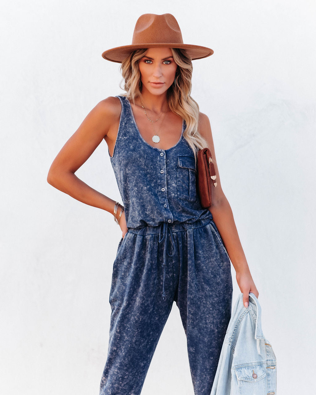 Unser Danica Pocketed Washed Knit Jumpsuit aus weichem, dehnbarem, marineblauem Strick sorgt für ein mühelos bequemes Tragegefühl. Dank des elastischen Kordelzugbunds, der Seitentaschen und des geraden Beinschnitts ist dieser Look zu Hause oder auch beim Ausgehen absolut angesagt! Mit Knopfverschluss vorne. Kombiniert mit dem El Dorado Hat. Perfect Creolen. Chloe Mini-Halskette. Mosaic Coin Halskette. Schlichter Armreif. Stella Crossbody Envelope Zip Clutch. Kaige Pocketed Distressed Denim Shacket. Und Blair Faux Suede Riemchensandalen mit Absatz.