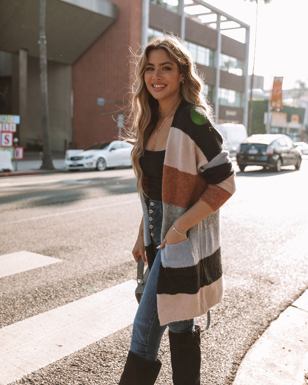 Peppen Sie Ihren Alltagslook mit unserer gestreiften Strickjacke Demetria mit Taschen auf! Schwarz, Rouge, Camel, Blau und meliertes Grau prägen dieses Modell. Mit Fronttaschen und offener Vorderseite. Kombiniert mit der minimalistischen Fischgrätenkette, dem Ana Gold Coin Lariat, der Highland Bag, dem Making Moves Bodysuit, der Nashville High Rise Skinny und den Saint Slouch Booties.