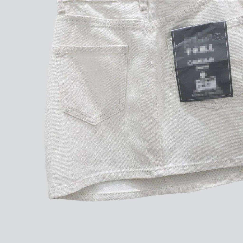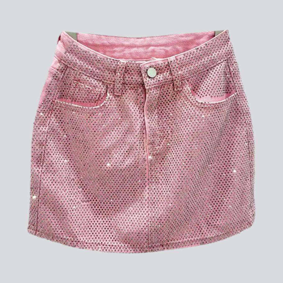 Entdecken Sie die modische Ode an die Y2K-Ära der Sommerkollektion 2023: den Jeansrock mit diamantverzierter Vorderseite! Dieses Meisterwerk mit mittlerer Taille ist aus locker sitzendem, aber strukturiertem Stoff gefertigt und verspricht einen Look, der gleichermaßen stilvoll und bequem ist.