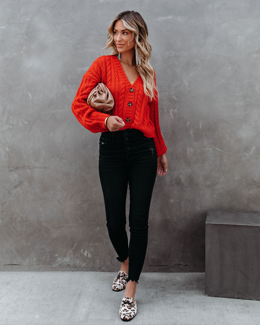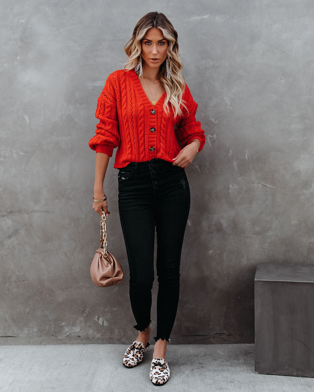 //INSSTREET// Unser herzzerreißender Zopfmuster-Cardigan mit Knopfleiste vorne ist ein echter Hingucker! Dieser rote Zopfmuster-Cardigan hat Knopfverschlüsse vorne und einen V-Ausschnitt. Das perfekte Herbst-Winter-Kleidungsstück! Kombiniert mit den auffälligen Bia-Perlen-Fransenohrringen, der Chloe-Mini-Halskette, der Buddha-Rad-Halskette, einem schlichten Armreif, einer schicken Crossbody-Tasche mit Kette, der Keen High Rise Button Front Skinny und den Adelia Leopard Loafer Mules.