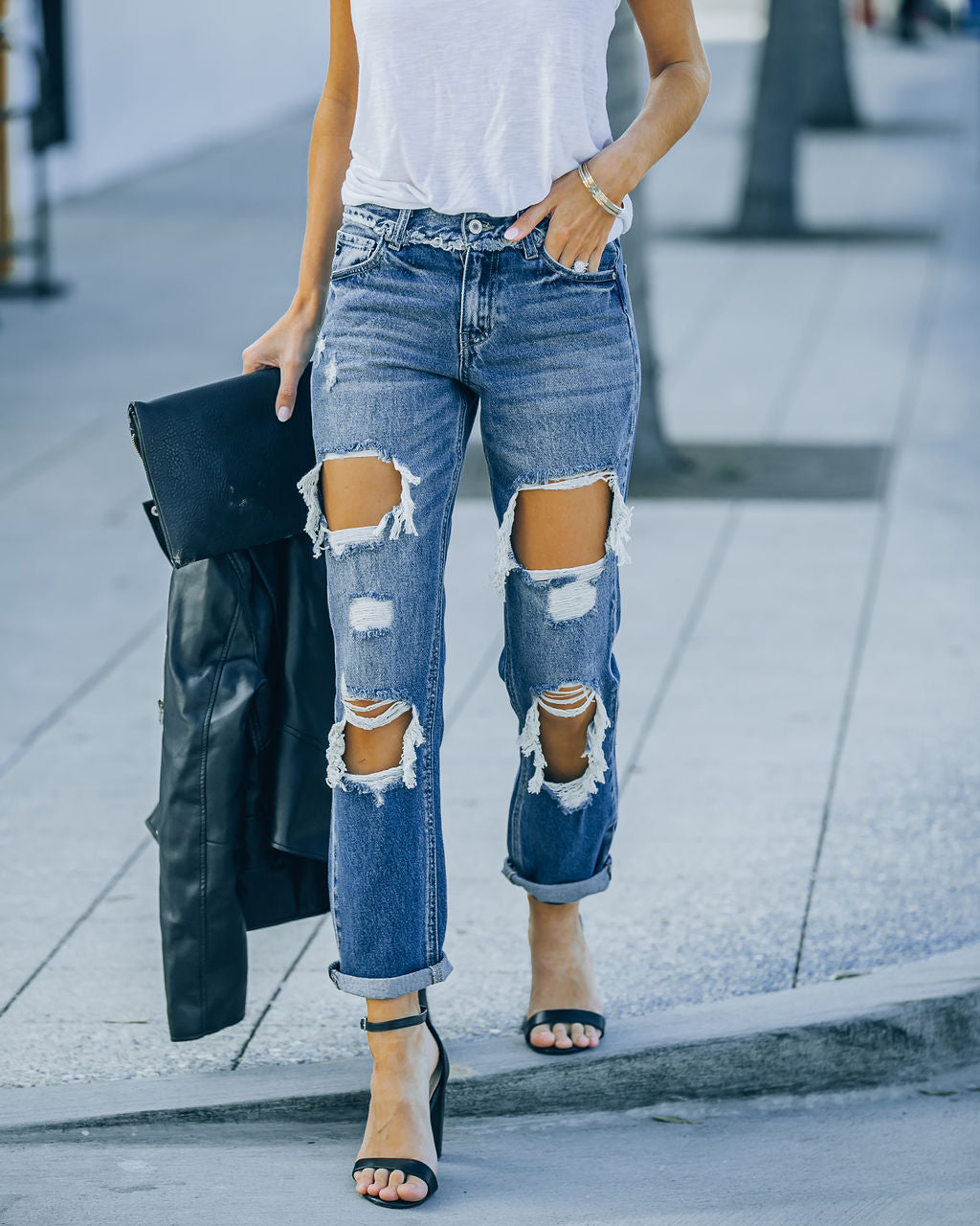 Unsere Jude Distressed Boyfriend Jeans sind so abgenutzt wie nie zuvor! Diese Jeans in dunkler Waschung hat eine mittelhohe Taille. Sie ist ohne Stretch und mit Reißverschluss und Knopf vorne versehen. Kombiniert mit der polarisierten Sonnenbrille „Carson“ mit schwarzem Rahmen und dunklem Rauchglas. Chloe Mini-Halskette. Compass Coin-Halskette. Schlichter Armreif. Stella Crossbody-Clutch mit Umschlag und Reißverschluss. Physique Racerback-Tanktop. Gramercy Kunstleder-Motorradjacke mit Taschen. Und Whimsy Heel.