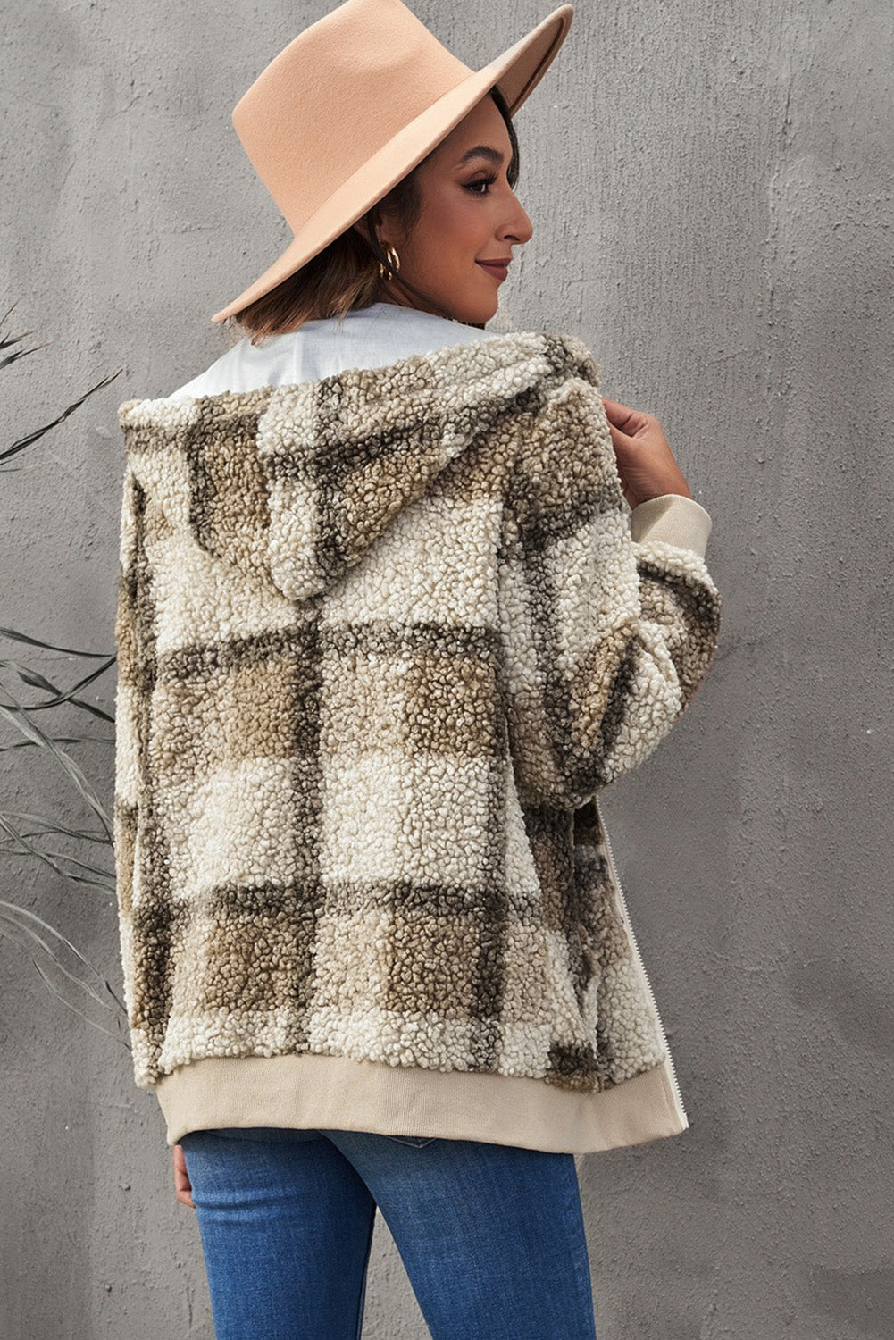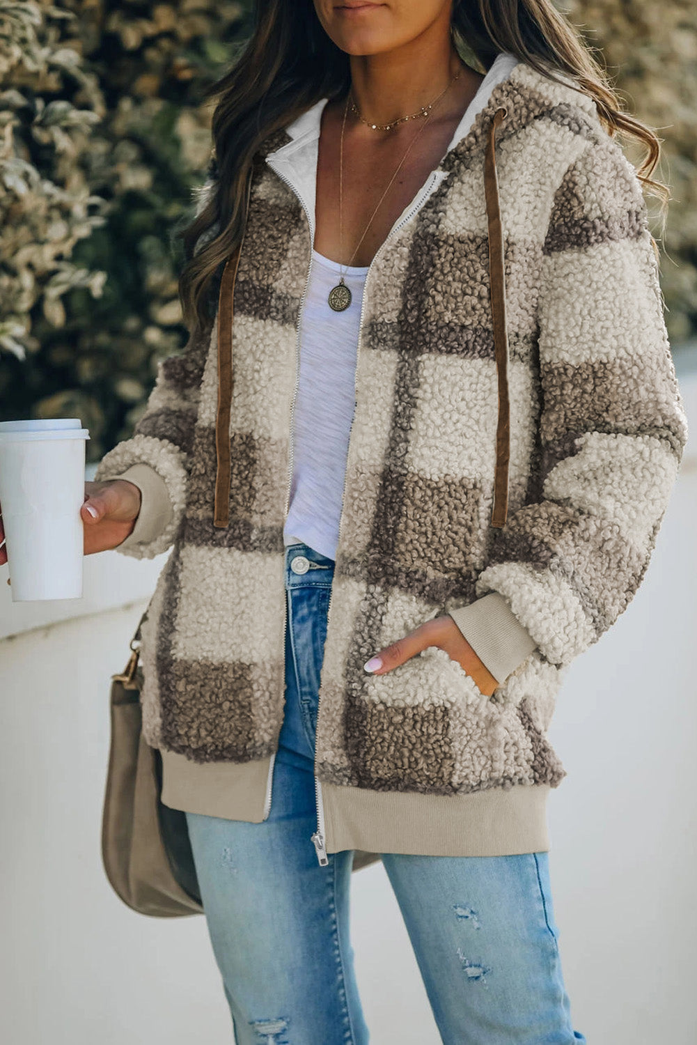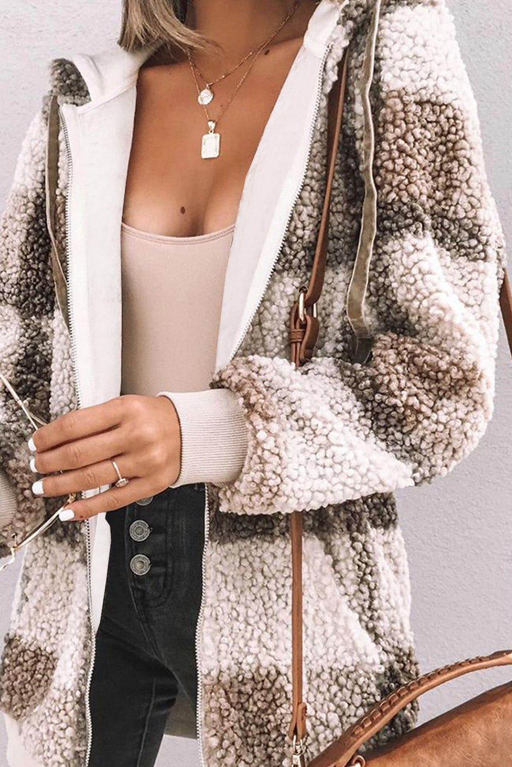 Mit seinem zeitlosen Stil und dem gemütlichen Tragegefühl wird der Fleece-Kapuzenmantel mit Reißverschluss und Karomuster in Khaki diese Saison garantiert zu Ihrem Lieblingsstück.