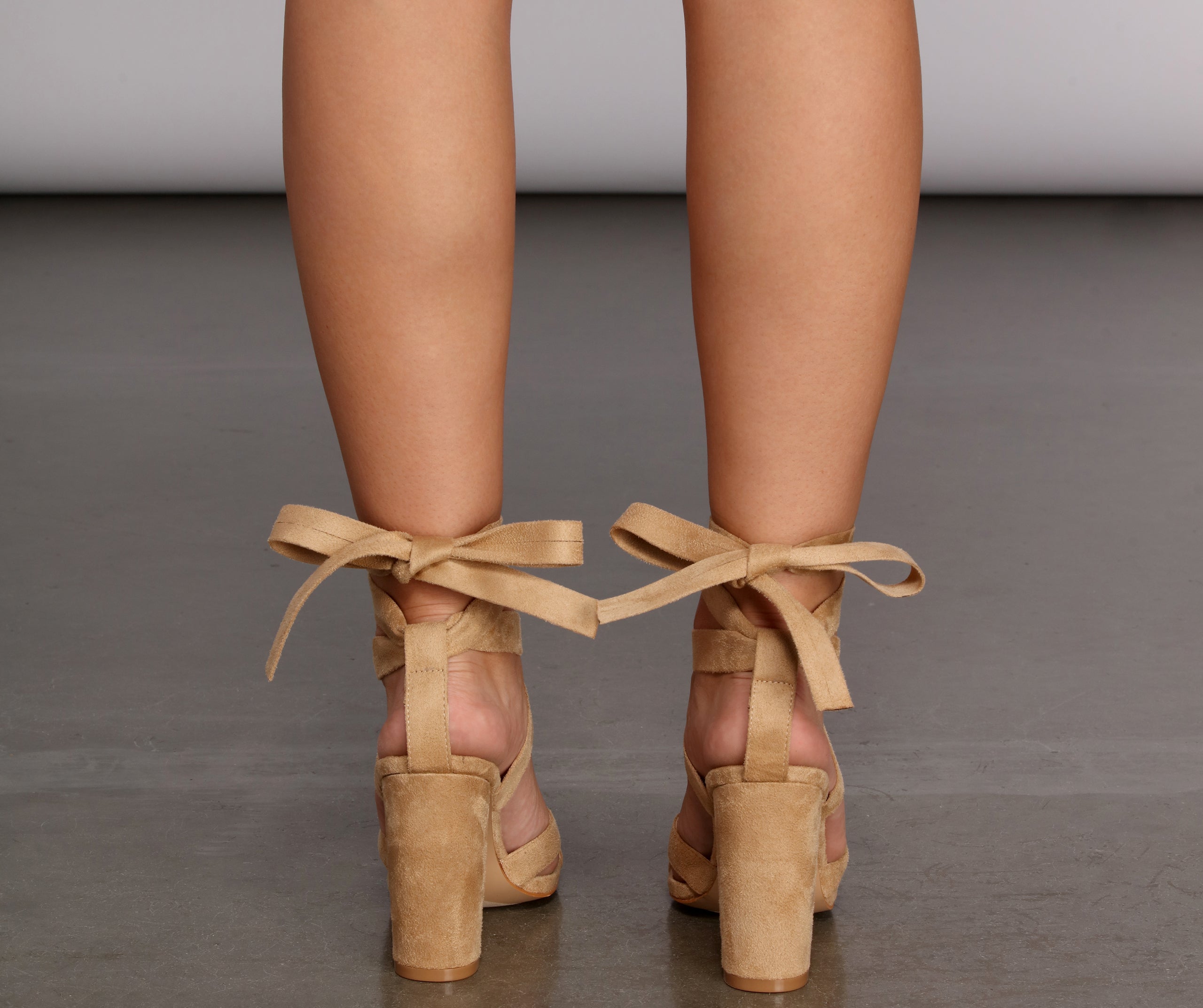 Schnüren Sie sich diese unverzichtbaren Pumps! Sie verfügen über Schnürriemen, eine offene Spitze mit überkreuzten Riemen und einen Blockabsatz. Sie bestehen aus Wildlederimitat und einer Innensohle aus Kunstleder.