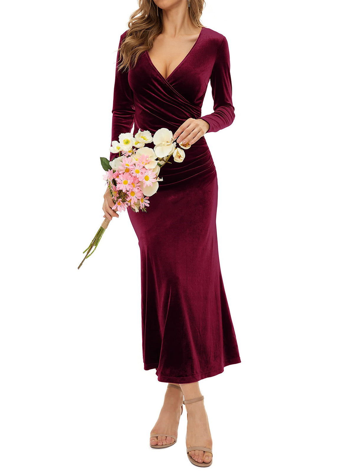 Eigenschaften: Einfarbig. Lange Ärmel. Gerüscht. Figurbetont. Elegant. Wickel-. Midi-Kleider.
