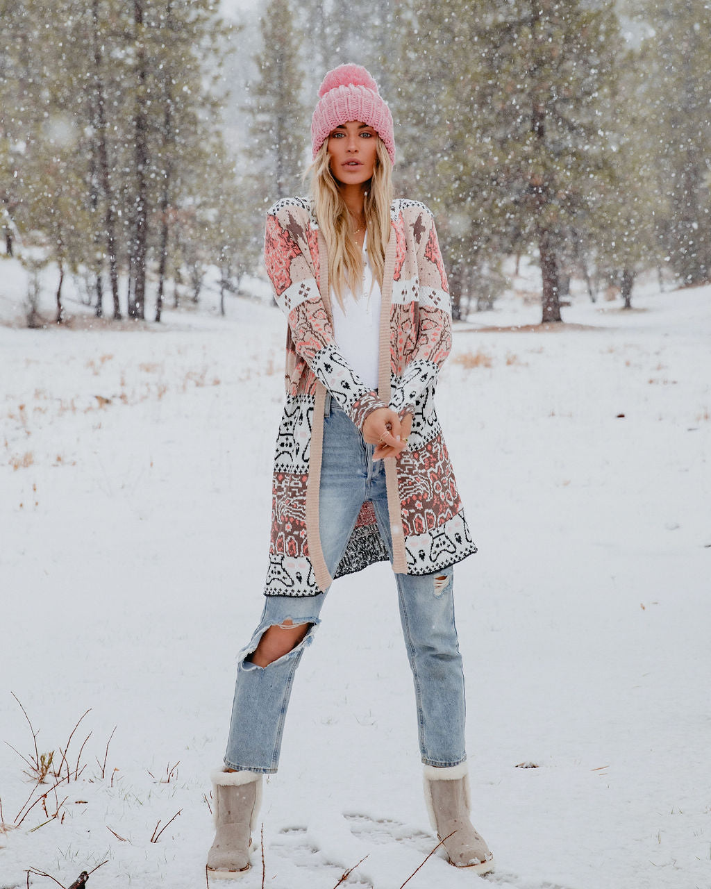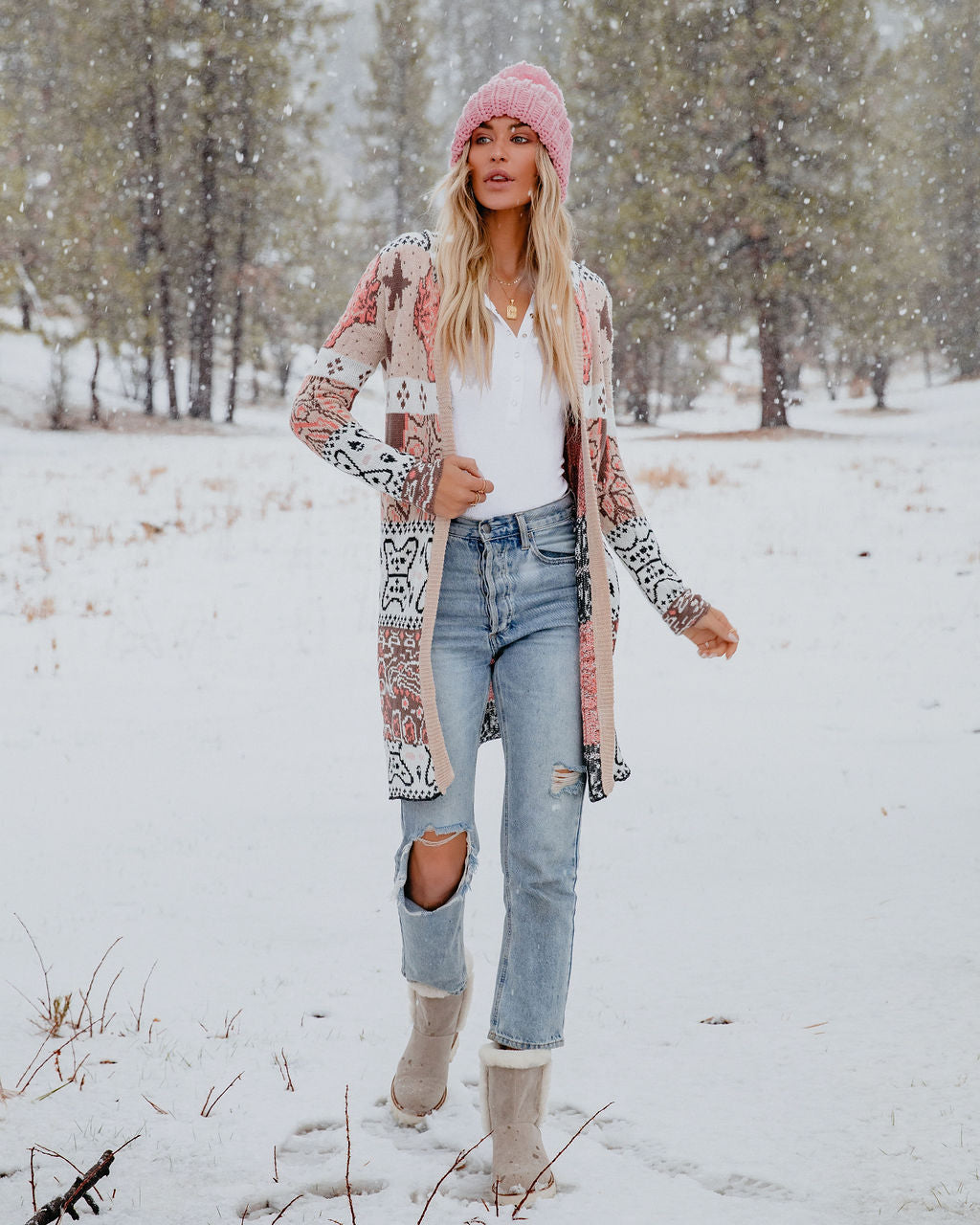 Unser „Magic Of The Season“-Strickcardigan mit Kapuze ist so vielseitig! Taupe, Mokka, Pink, Weiß und Cremetöne prägen diesen Cardigan. Mit offener Vorderseite und Seitenschlitzen. Ohne Verschlüsse. Kombiniert mit der Whistler Pom Beanie. Perfekte Creolen. Chloe Mini-Halskette. Initialen-Kartenkette. Schlichter Armreif. Elise gerippter Henley-Body. Kason Distressed High Rise Denim. Und nordische Stiefel mit Kunstfellbesatz.