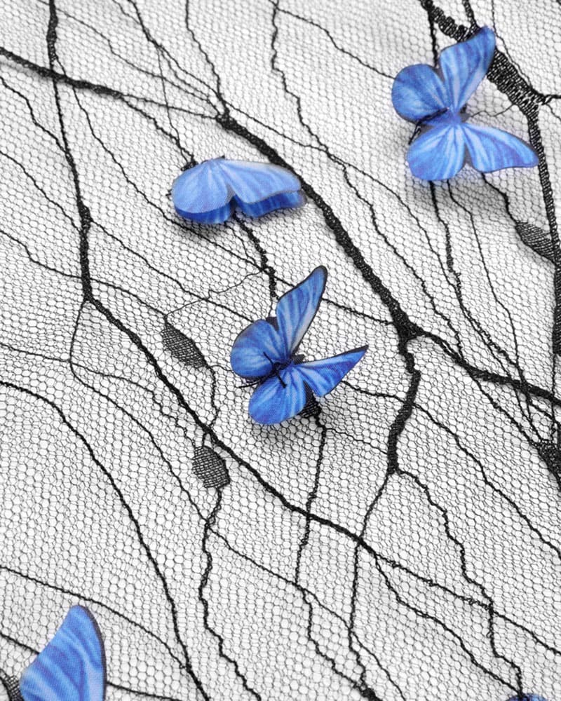 Details : Durchsichtiges Mesh-Set. Mit langärmligem Crop-Top mit Schleifendesign vorne und asymmetrischem kurzen Rock.