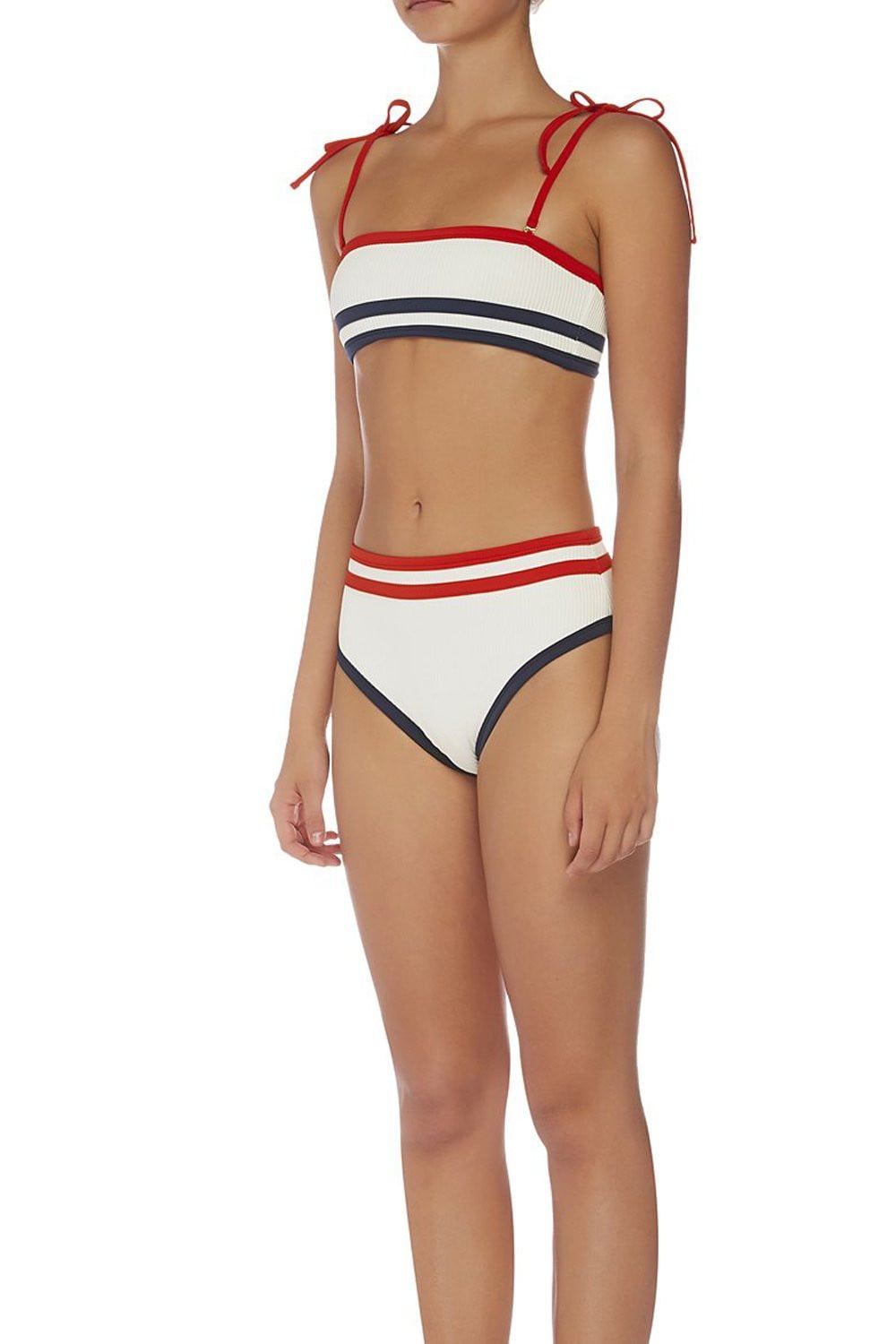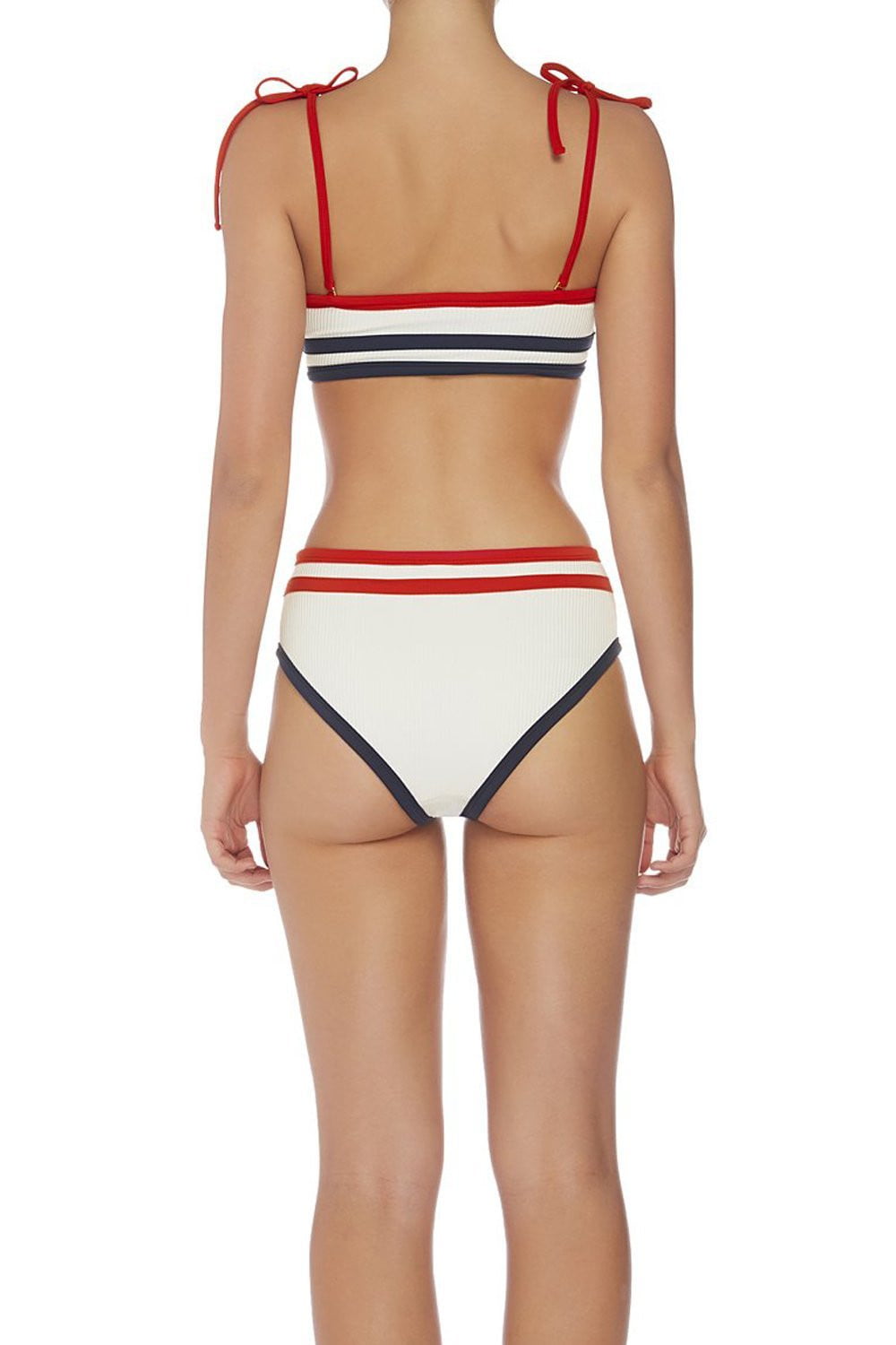 Rot-schwarz gestreiftes geripptes Bikinioberteil mit Schulterschnürung