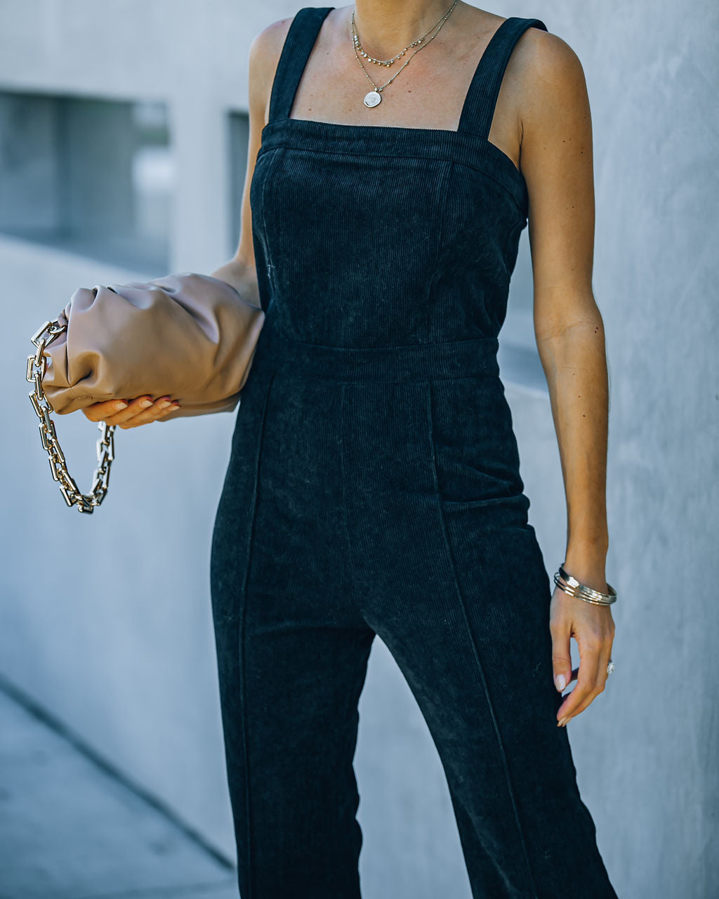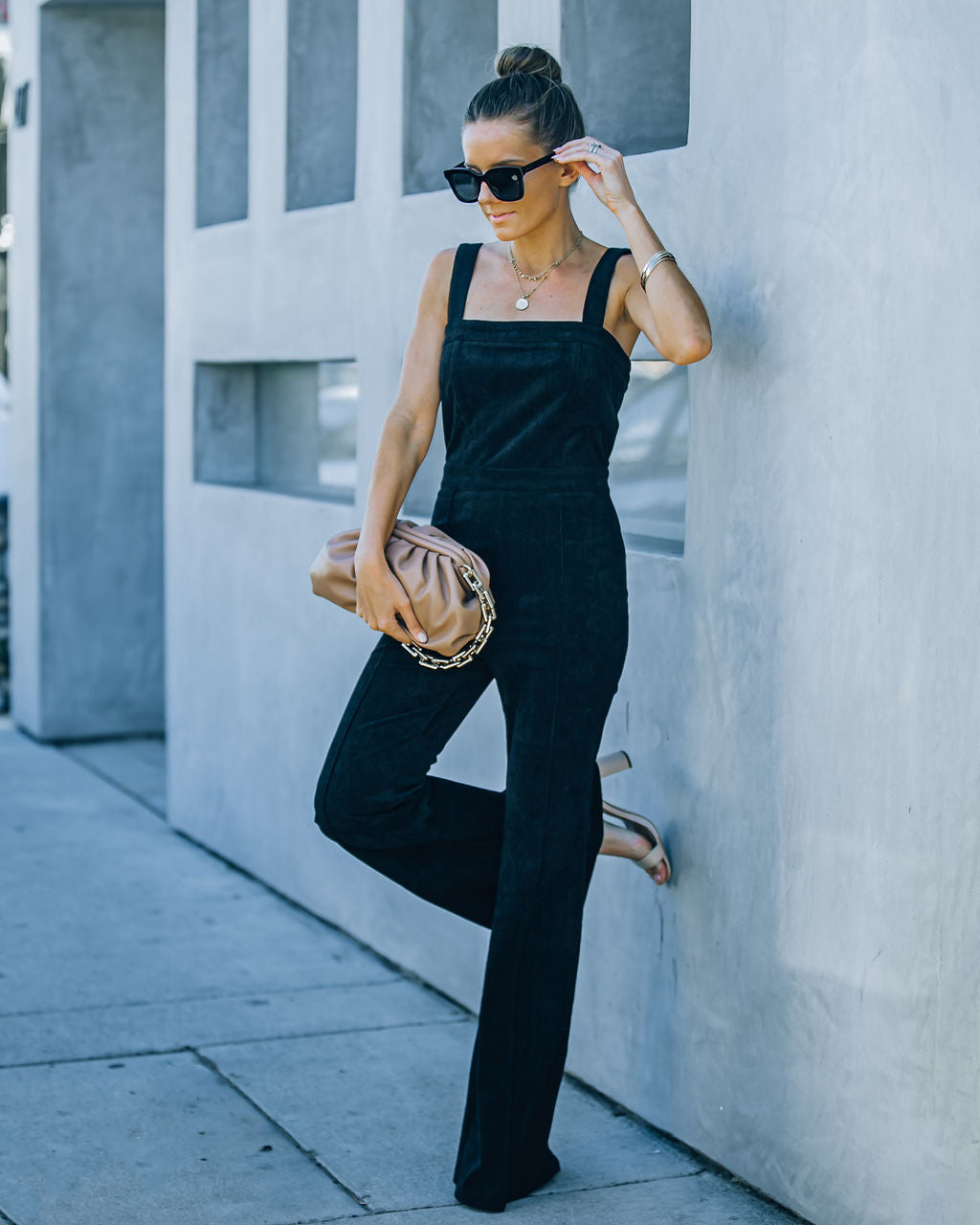 Unser Remi Corduroy Flare Jumpsuit ist bereit für eine Nacht in der Stadt! Dieser schwarze Jumpsuit hat einen quadratischen Ausschnitt. Er hat ausgestellte Hosenbeine und einen strukturierten Bund. Der Reißverschluss auf der Rückseite sorgt für zusätzlichen Halt. Kombiniert mit der polarisierten Sonnenbrille Carson in dunklem Rauchgrau mit schwarzem Rahmen, der Chloe Mini-Halskette, der Kompass-Münzkette, dem schlichten Armreif, der schicken Crossbody-Tasche mit Kette und dem Whimsy Heel.