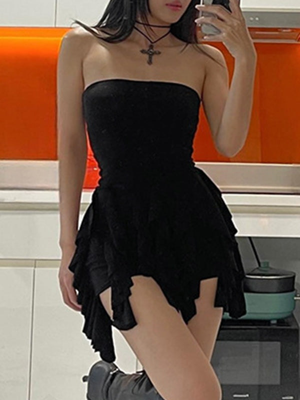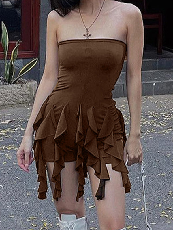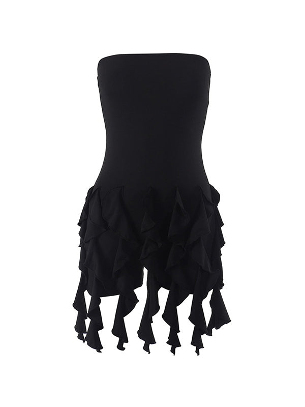 Beschreibung: Figurbetonte Silhouette mit mehreren verlängerten Rüschenbesätzen am Saum.