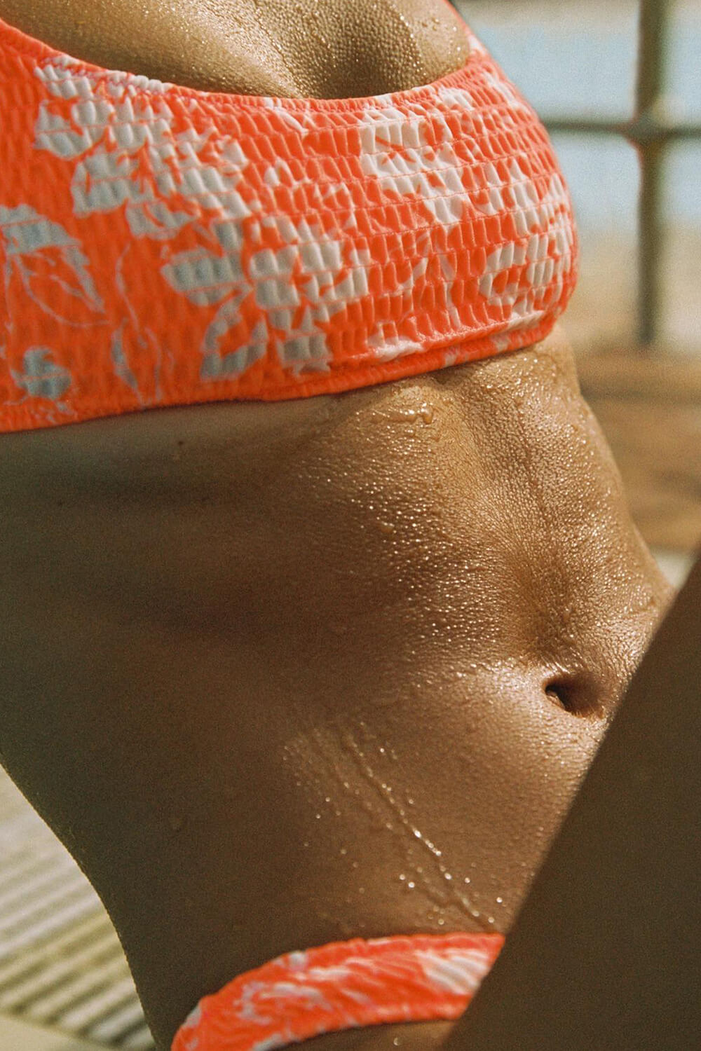 Lachsfarbene Bikinihose mit Blumenmuster und hohem Beinausschnitt und Rüschen