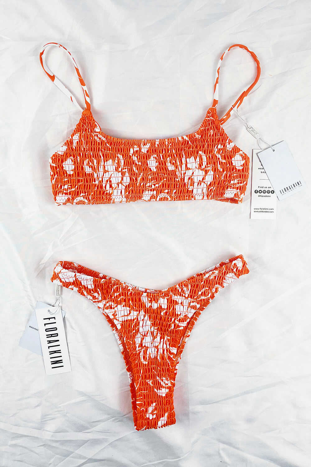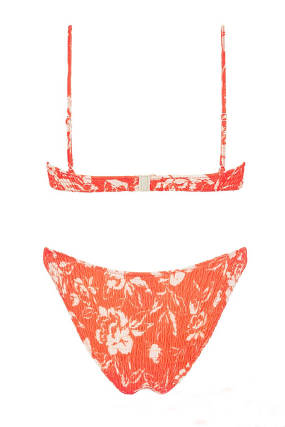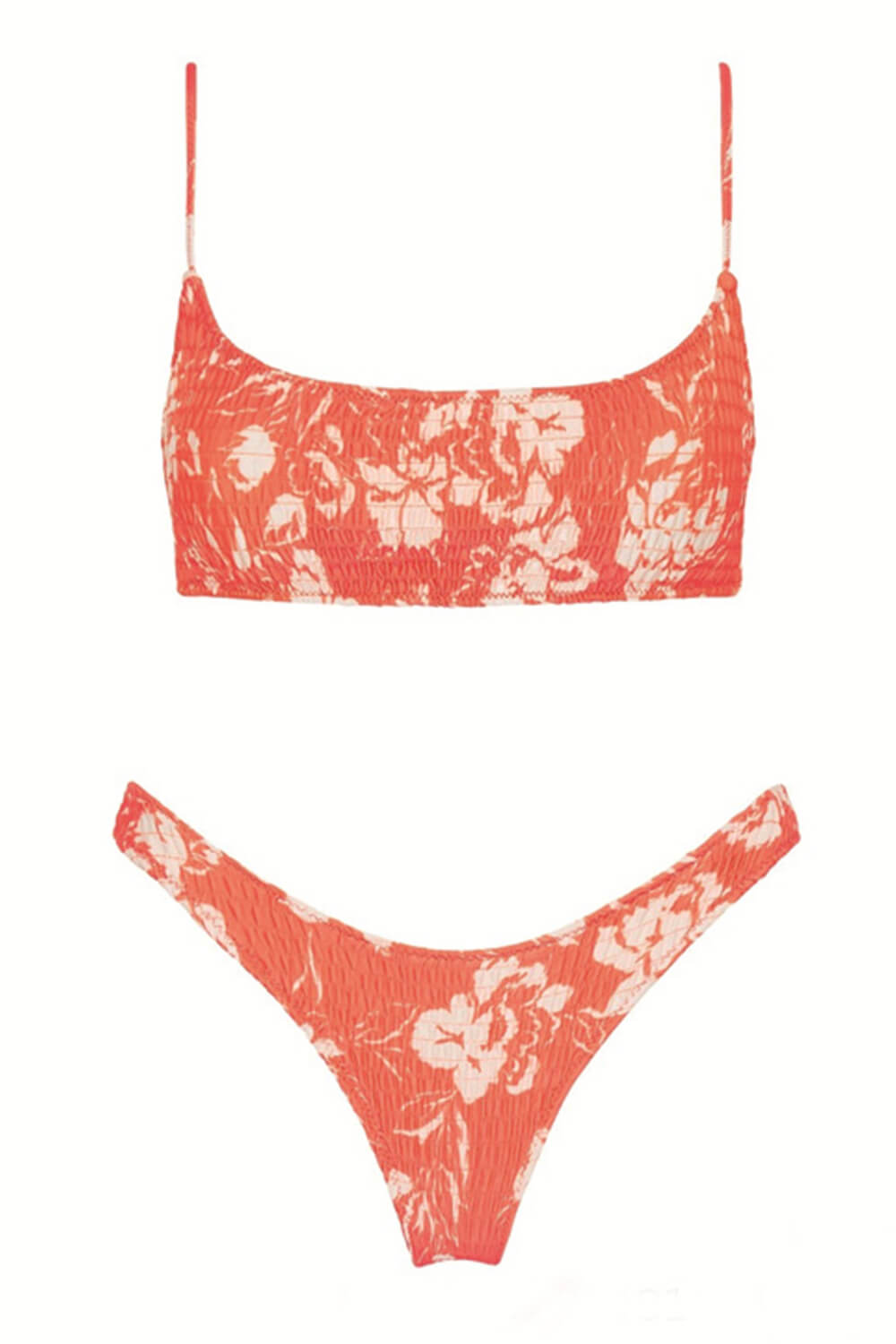 Lachsfarbenes, gerüschtes, kurzes Bikinioberteil mit U-Ausschnitt und Blumenmuster