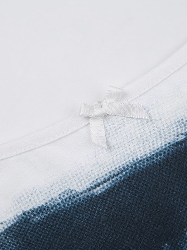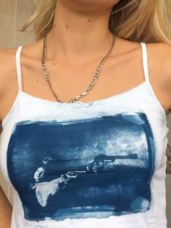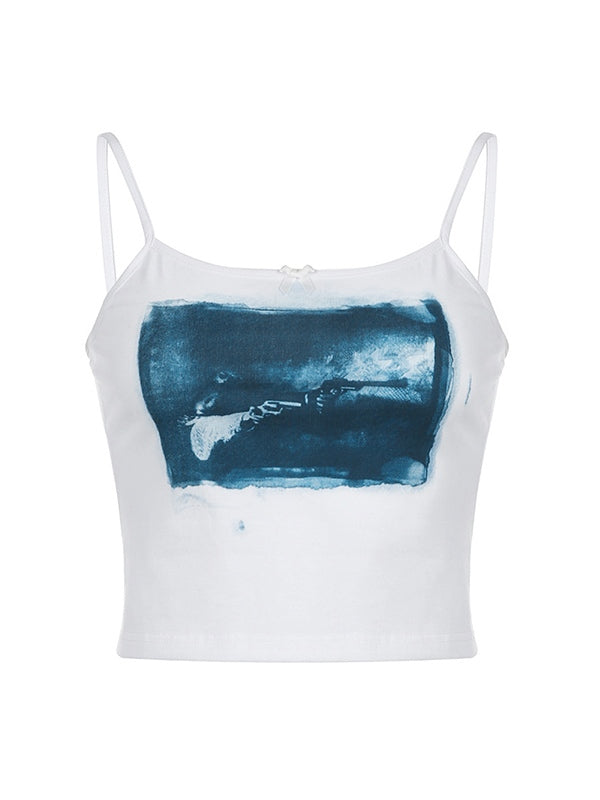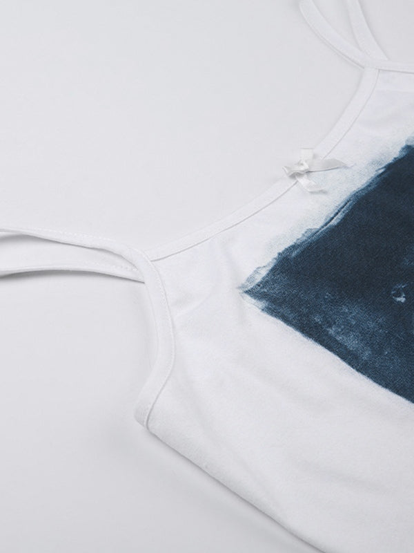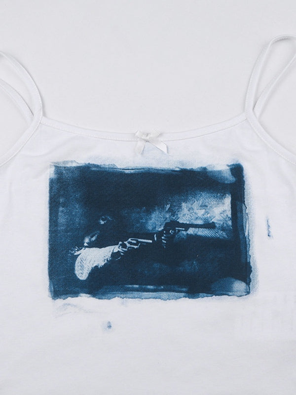 Beschreibung: Dieses einfache, aber dennoch Retro-Camisole-Oberteil hat eine schmale Silhouette in verkürzter Länge. Es ist mit einer kleinen Schleife verziert und hat ein vom Film inspiriertes Muster mit Design.