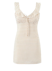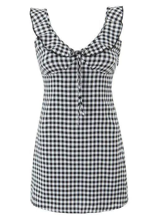 Beschreibung: Dieses Minikleid im Retro-Stil für Mädchen hat einen Tank-Träger-Stil mit durchgehendem Karomuster-Print, einen geschlitzten Saum, einen U-förmigen offenen Rücken und einen verdeckten Reißverschluss auf der Rückseite.