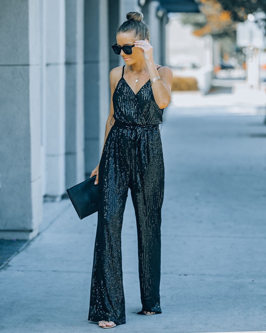 //INSSTREET// Das ultimative Outfit, das alle Blicke auf dich zieht! Unser Starry Night Pailletten-Jumpsuit ist schwarz mit glitzernden Pailletten. Er hat einen drapierten Ausschnitt und ein weites Hosenbein. Der verstellbare Taillengürtel sorgt für einen sicheren Halt. Kombiniert mit der polarisierten Carson Sonnenbrille mit schwarzem Rahmen in dunklem Rauchgrau. Chloe Mini-Halskette. Kompass-Münzkette. Schlichter Armreif. Stella Umhänge-Clutch mit Reißverschluss und Bella Riemchen-Kitten-Heel-Schuhe aus Kunstleder.