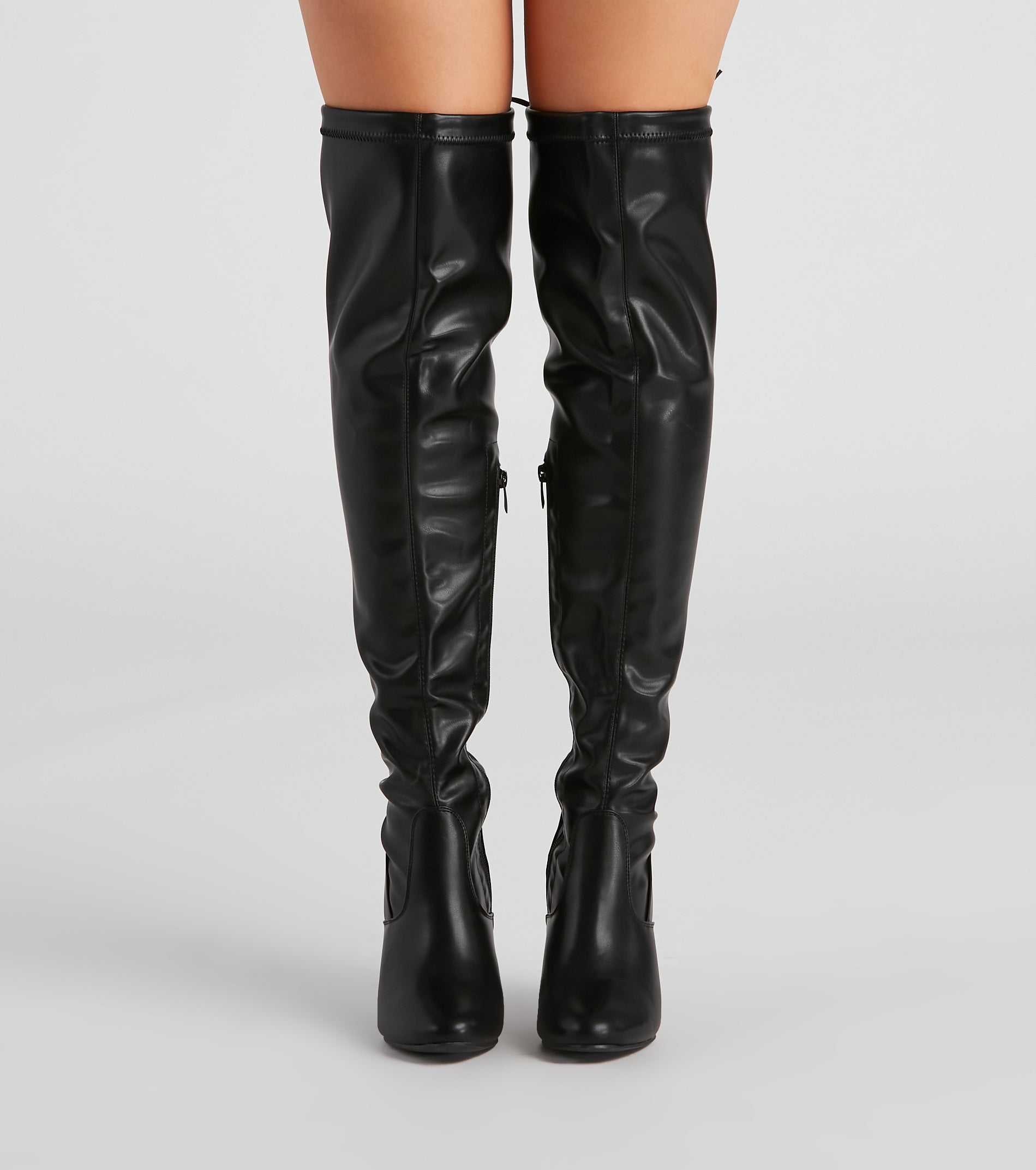 Stilvoll präsentiert sich dieser elegante Overknee-Stiefel aus Kunstleder. Er hat eine mandelförmige Spitze, einen hohen Blockabsatz, einen Reißverschluss innen und ein Bindeband am oberen Ende. Kombinieren Sie ihn mit einem figurbetonten Kleid und einer Motorradjacke .