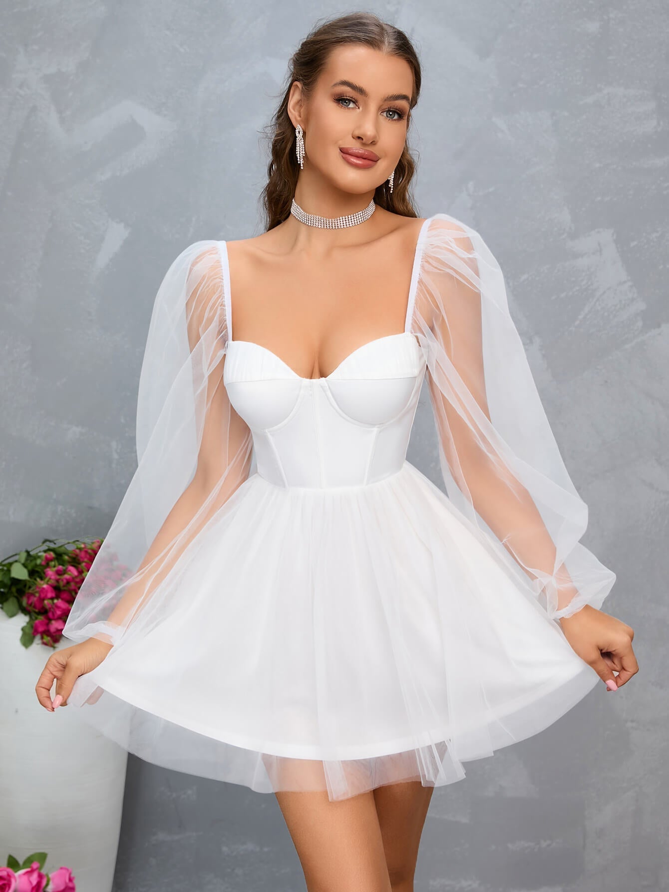 Bustierkleid mit Herzausschnitt, Laternenärmeln und Netzstoff-Overlay
