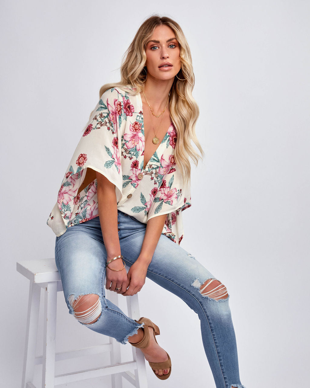 //Meistverkaufte Silhouette// Feminin und hübsch. Das Sycamore Floral Button Down Kimono Top in Elfenbein hat Blumenmuster in den Farben Röte, Magenta, Gelb, Hellblau, Salbeigrün und Schwarz.