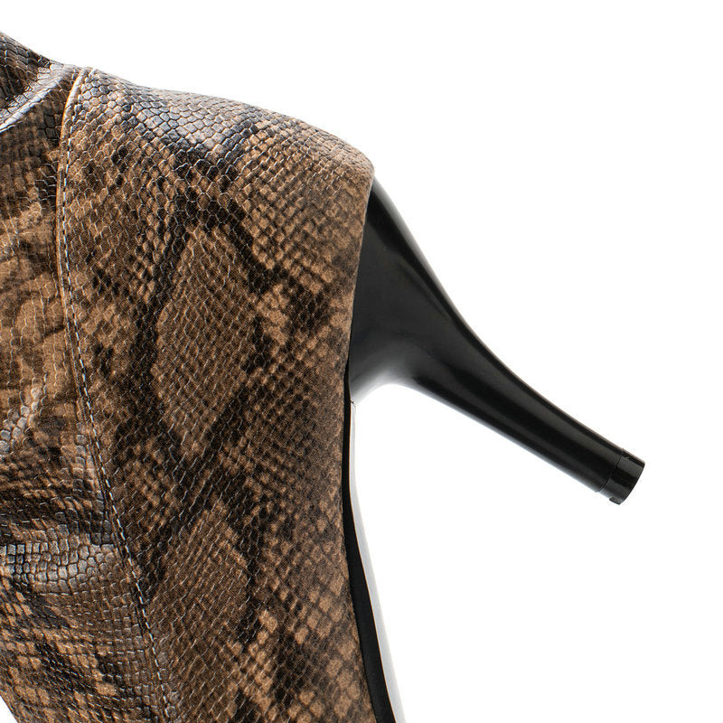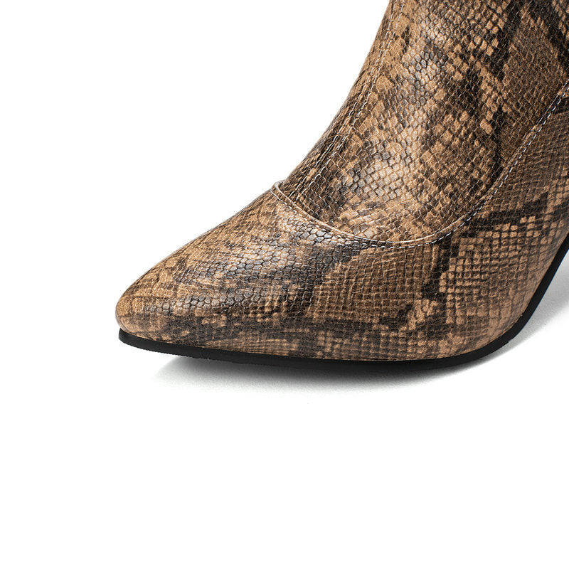 Setzen Sie mit Stiefeln einen schicken Akzent und werten Sie Ihr Outfit auf. Die Stiefel haben ein Schlangenmuster, einen Reißverschluss innen, eine spitze Zehenpartie und einen Blockabsatz. Die Stiefel bestehen aus Kunstleder. Komplettieren Sie den Look mit einer Strickjacke und einem Minirock.