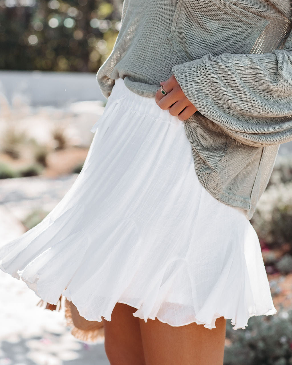 Ein Muss für den Frühling: der Minirock „Movin‘ Fast“ von Times mit Rüschen in einem strukturierten Off-White-Stil mit elastischer Taille und aufgenähter Quaste zum Binden.