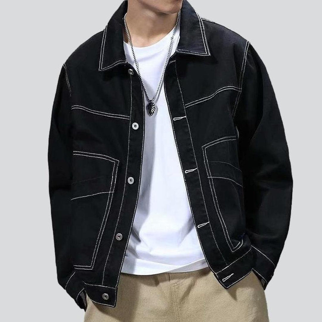 Entdecken Sie die trendige schwarze Jeansjacke unserer Frühjahr-Sommer-Kollektion 2023 für urbane Männer! Dieses übergroße und elastische Kleidungsstück im monochromen Look mit Knopfverschluss ist die perfekte Mischung aus Vintage-Flair und modernem Trend. Tragen Sie es und setzen Sie ein starkes Trend-Statement!