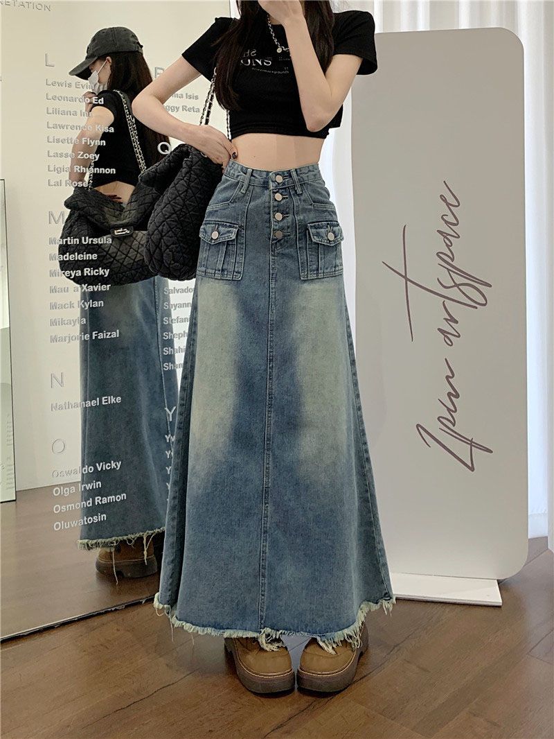 Wir präsentieren unseren langen Jeansrock im Vintage-Stil aus der Frühjahr-/Sommerkollektion 2023 – die perfekte Mischung aus urbanem Trend und nostalgischem Charme!