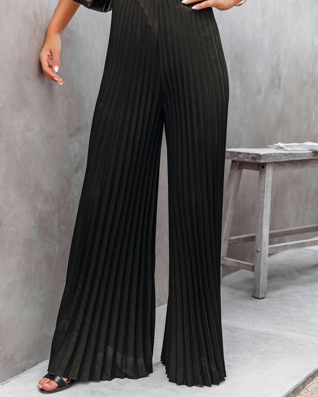 Kunstleder ist einfach sexy! Unser VIP-trägerloser Kunstleder-Plissee-Jumpsuit ist in Schwarz mit Kunstleder-Oberteil erhältlich. Die plissierte Hose mit weitem Bein ist perfekt fließend. Der Reißverschluss auf der Rückseite sorgt für zusätzlichen Halt. Kombiniert mit den auffälligen Statement-Ohrringen, dem 5-Scheiben-Choker, der Chloe-Mini-Halskette, der Kompass-Münzkette, dem schlichten Armreif, der schicken Crossbody-Tasche mit Kette und dem Whimsy Heel.