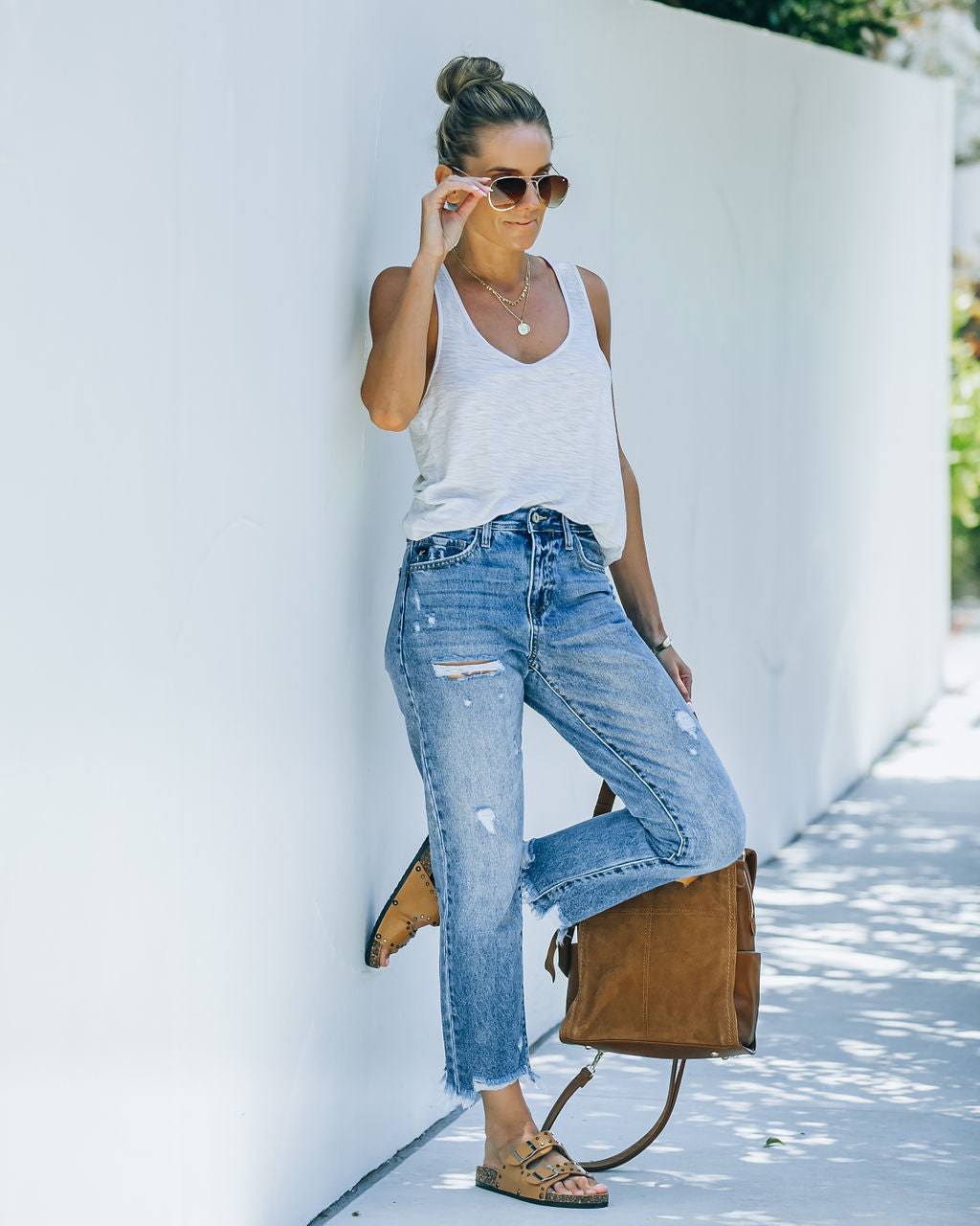 //InsStreet Exklusiv// Unsere Zach High Rise Distressed Straight Leg Denim ist der perfekte Look für coole Girls! Diese dunkel gewaschene High Rise Jeans hat einen ausgefransten Knöchel und ist nicht dehnbar. Abgerundet wird das Ganze durch einen klassischen 5-Pocket-Schnitt, einen Hosenschlitz mit Reißverschluss und Knopfverschluss. Kombiniert mit der Chloe Mini-Kette, einer Compass Coin-Kette, einem schlichten Armreif, einem Kenzie Rucksack, einem Physique Racerback Tanktop und einer Tilly Nietenschnallen-Sandale.