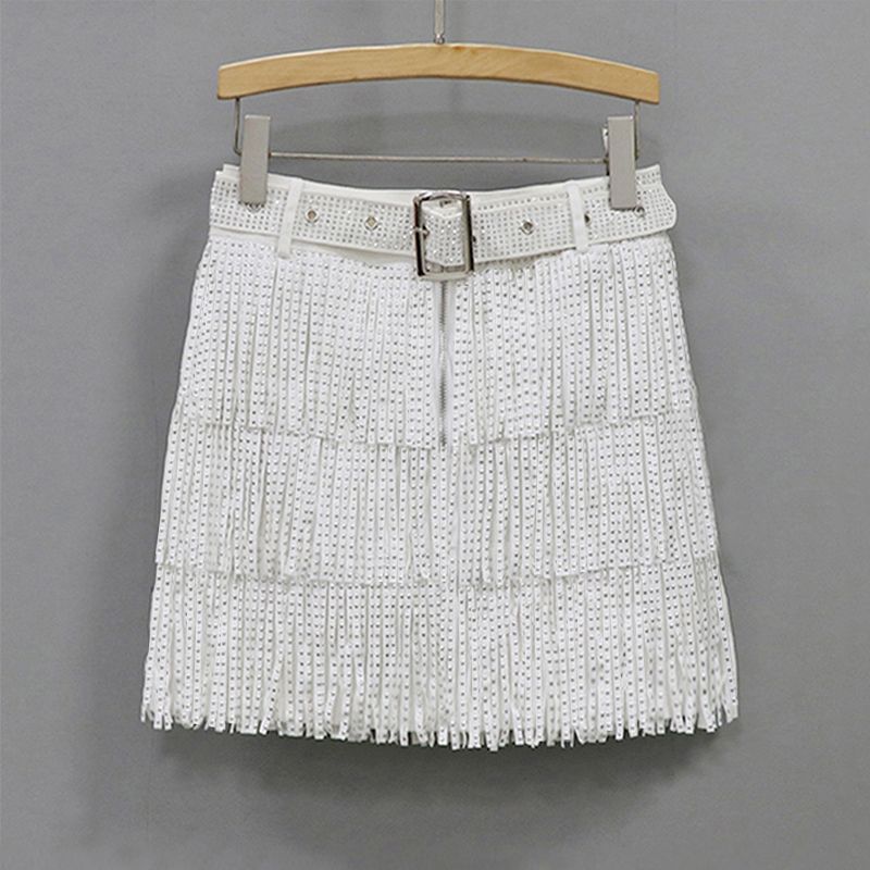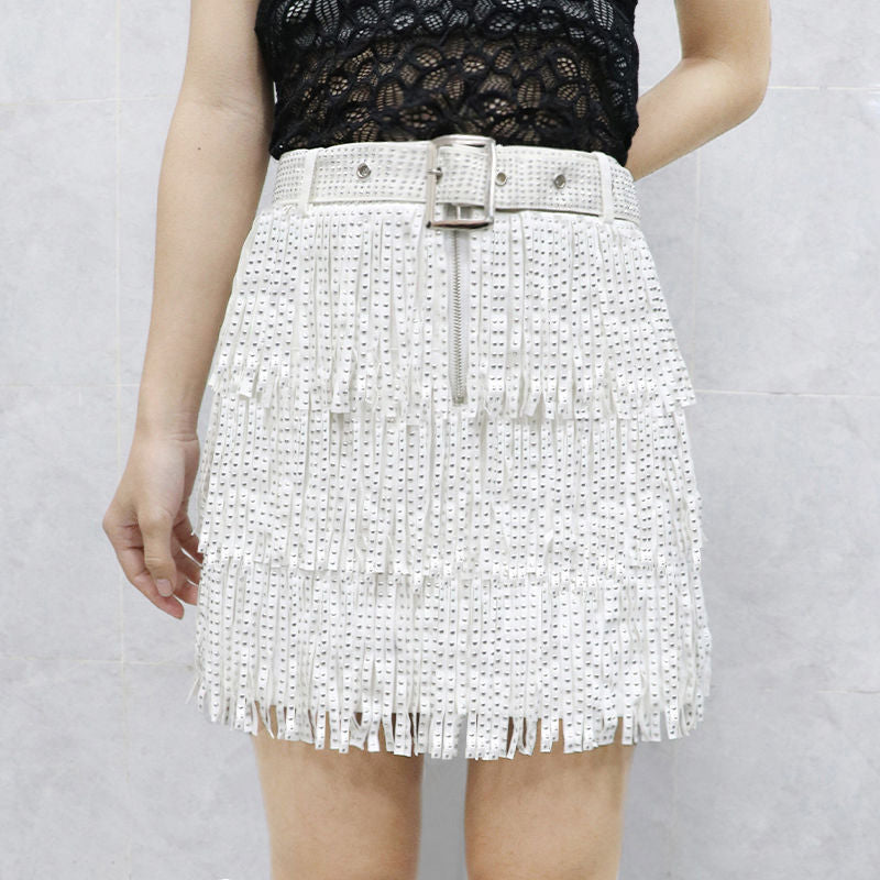 //Exklusiv bei InsStreet// Bestseller// Neue Farbe// Feiern Sie den Samstag im Zoie Studded Fringe Minirock in Weiß mit silbernen Fransenstufen und strukturiertem Bund.