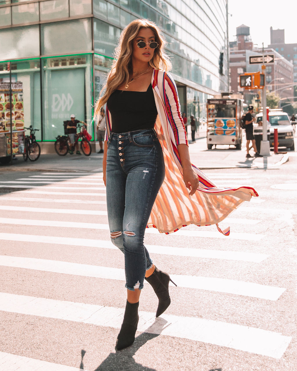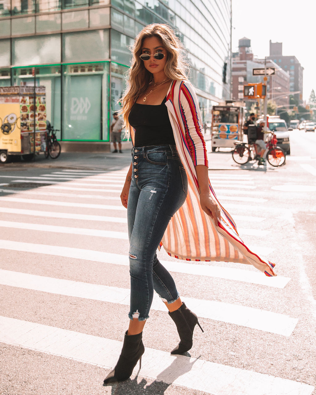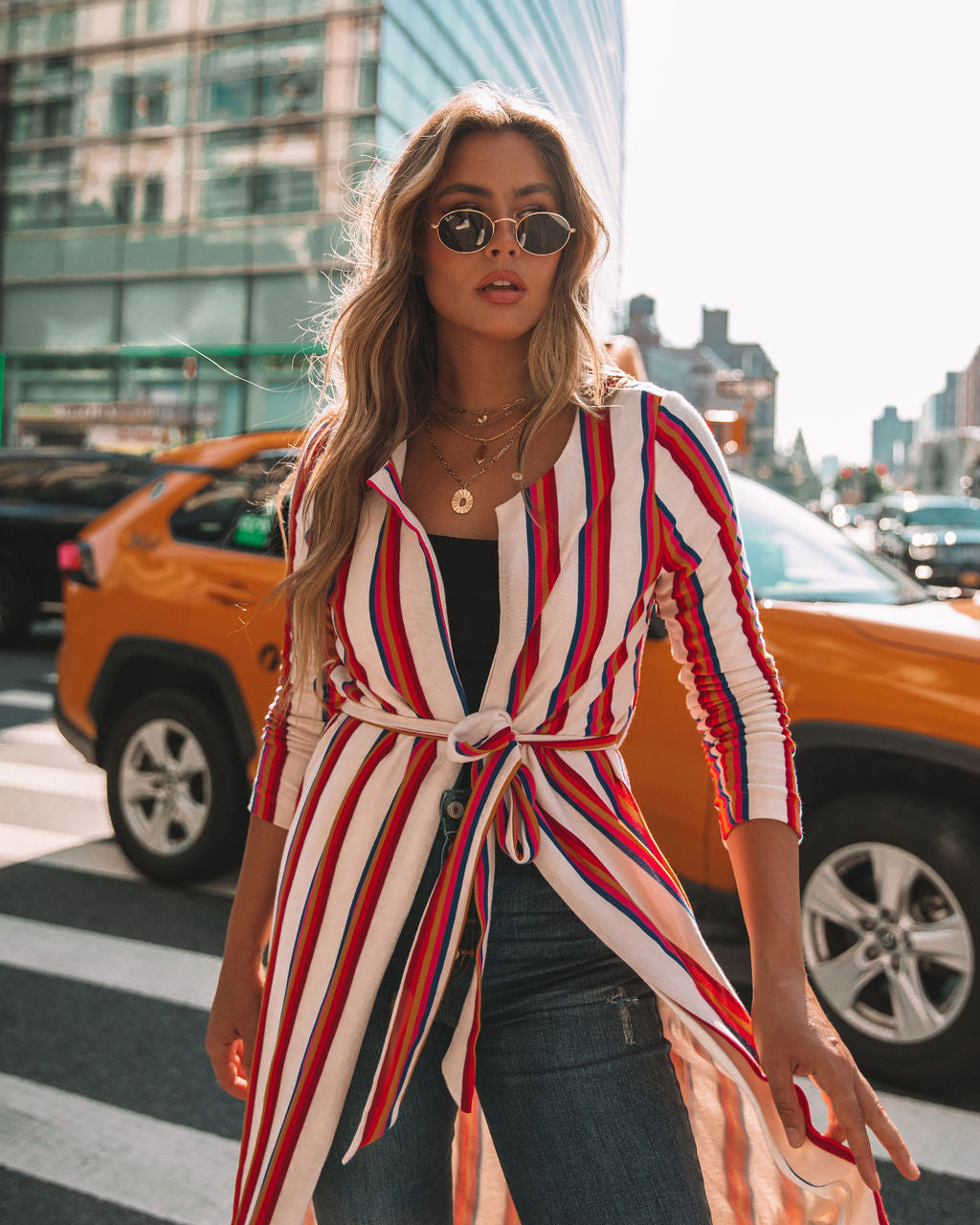 Look on the bright side! We love this rainbow-bright print of orange. red. yellow. magenta. and cobalt stripes! The soft knit feel of our Bright Side Duster Cardigan in this beige base color. Complete with an open neckline and waist tie! Styled with Coasta Layered Pendant Necklace. Making Moves Bodysuit. Tilley Frayed Ankle High Waisted Skinny. and Britt Faux Suede Heeled Bootie.